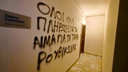 “Όλοι θα πληρώσετε το αίμα για τα Τέμπη” – Παρέμβαση Ρουβίκωνα στο γραφείο του Σιμόπουλου στη Θεσσαλονίκη