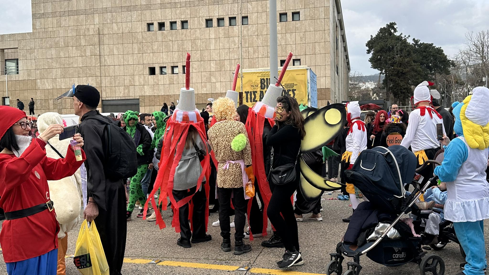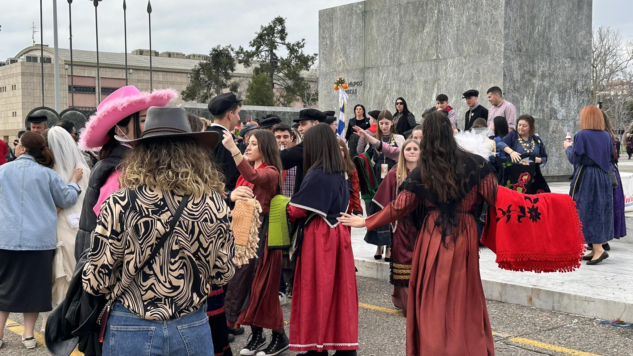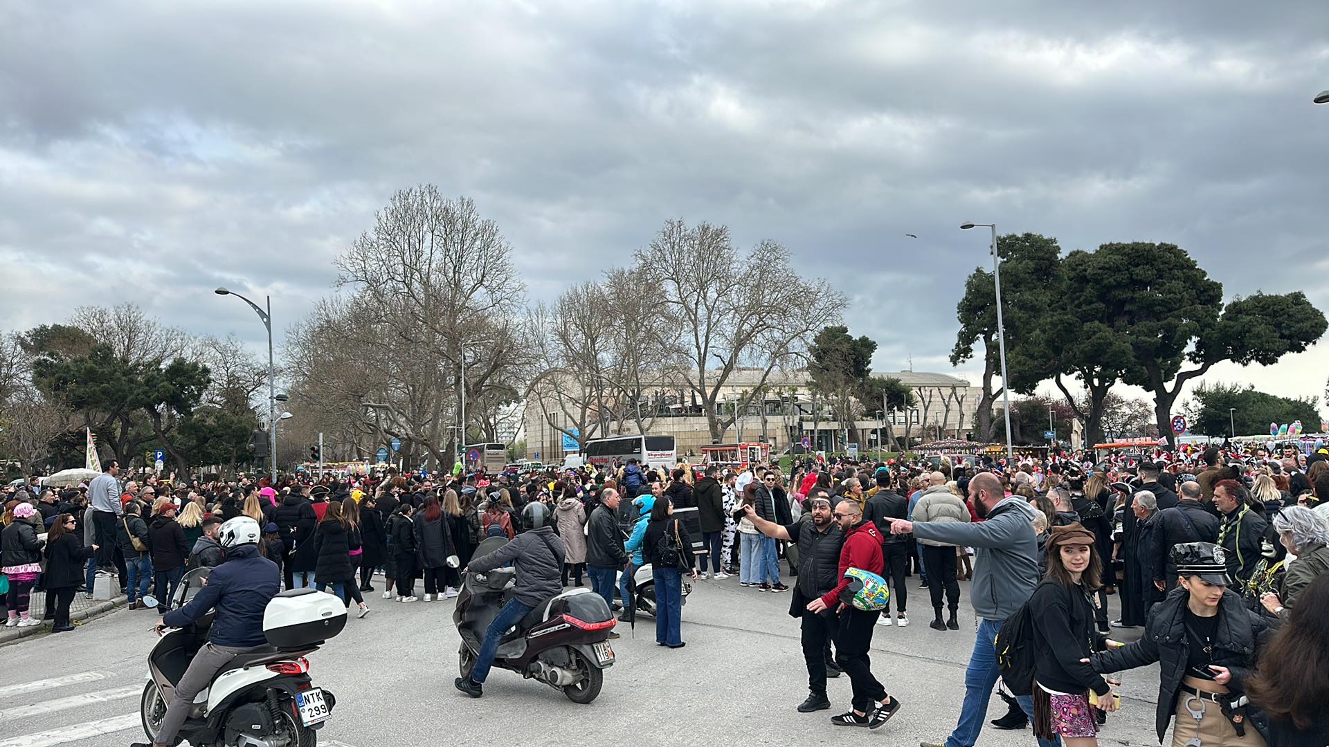 Πλήθος κόσμου έχει συγκεντρωθεί στο σημείο για να γιορτάσει τα καρναβάλια, με μοναδικές στολές, κέφι, τραγούδι και χορό, παρά την προειδοποίηση της τροχαίας ότι οι δρόμοι θα παραμείνουν ανοιχτοί.