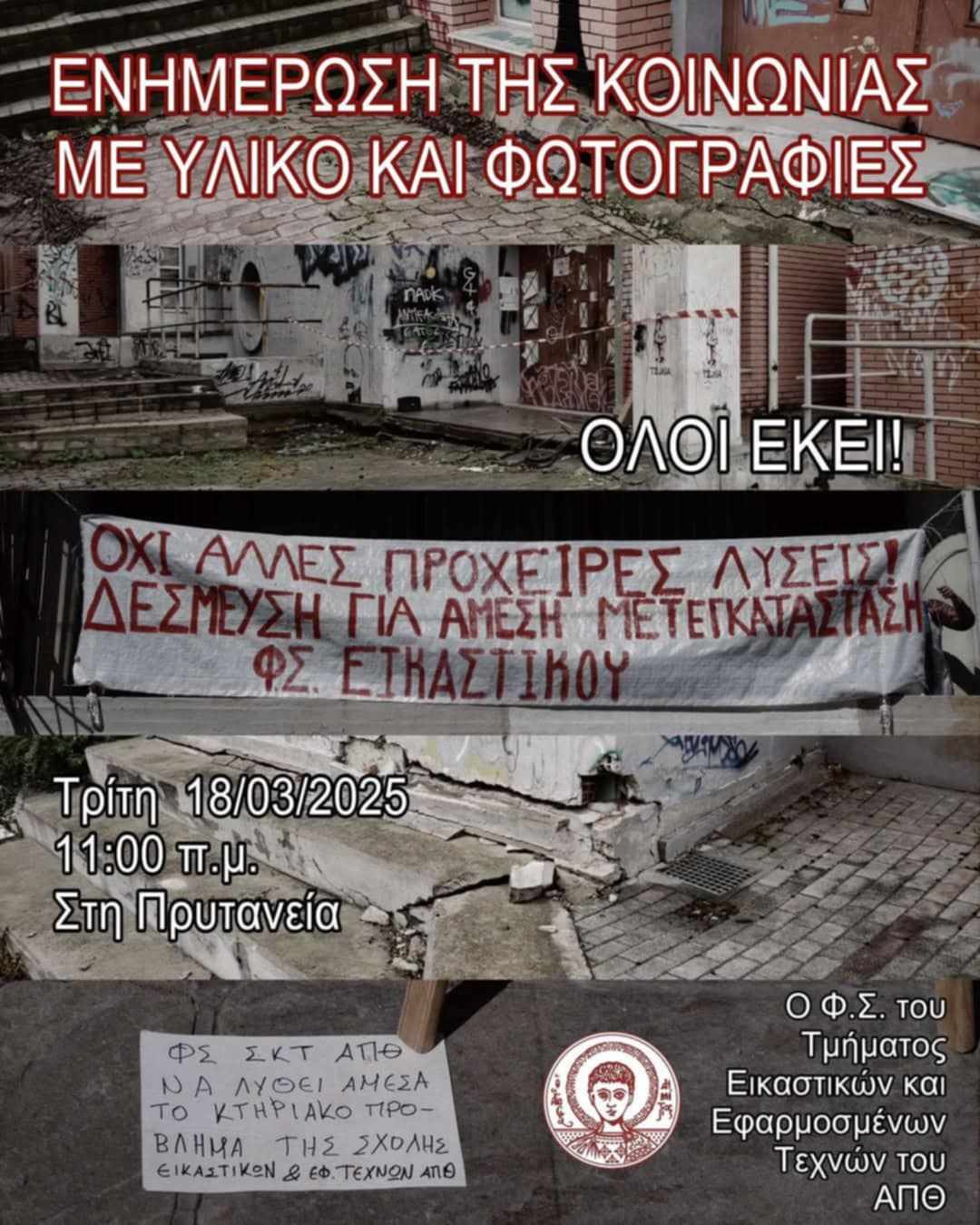 Σε διαμαρτυρία καλεί αύριο το πρωί (18/03), ο Φοιτητικός Σύλλογος του Τμήματος Εικαστικών και Εφαρμοσμένων Τεχνών του ΑΠΘ, έξω από την Πρυτανεία του Πανεπιστημίου για τα σοβαρά προβλήματα που αντιμετωπίζουν τα κτίρια της Σχολής Καλών Τεχνών στη Θέρμη.
