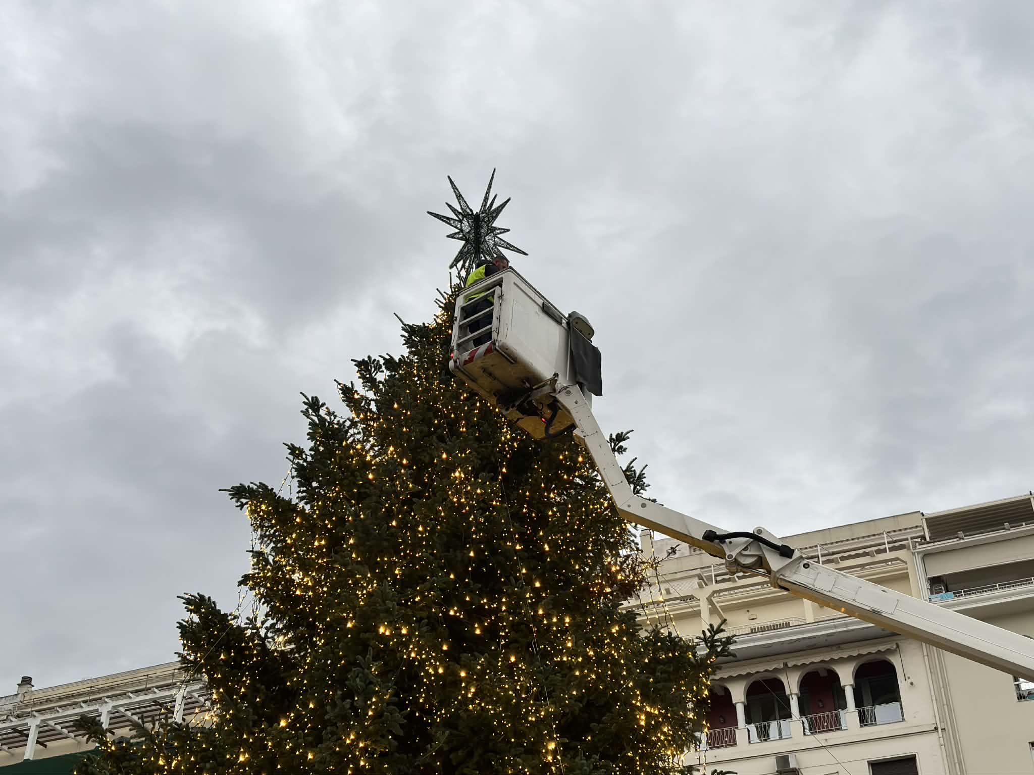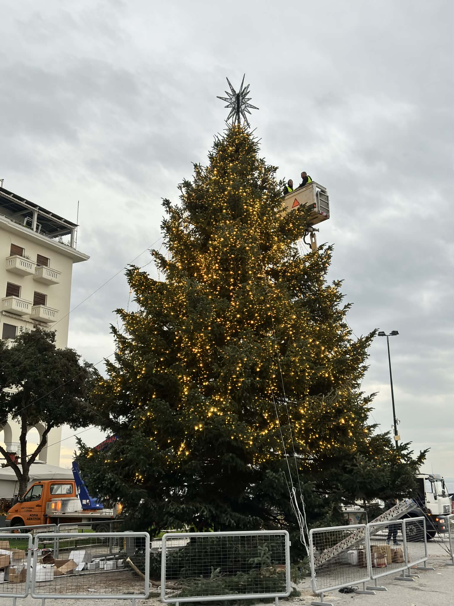 Στο κέντρο των εντυπώσεων βρίσκεται φέτος το χριστουγεννιάτικο δέντρο, ύψους 18 μέτρων, το οποίο ταξίδεψε από το Παλαιοχώρι Χαλκιδικής για να πάρει τη θέση του στην πλατεία. Η μεταφορά του δεν ήταν καθόλου απλή υπόθεση: το μεγάλο μέγεθος και η πυκνή κόμη του κάλυπταν σχεδόν δύο λωρίδες κυκλοφορίας, απαιτώντας ειδικό σχεδιασμό και προσεκτικούς χειρισμούς μέχρι να φτάσει με ασφάλεια στο κέντρο της πόλης.