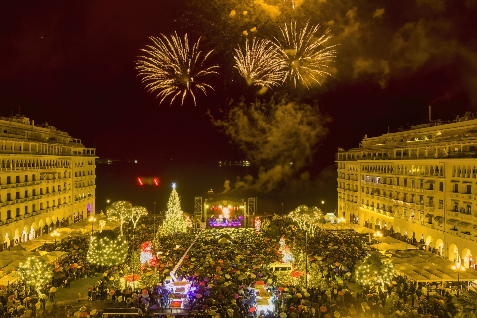 Η γιορτή ξεκινά στις 20:00, με τη Φιλαρμονική Ορχήστρα του Δήμου Θεσσαλονίκης να πλημμυρίζει το κέντρο της πόλης με κάλαντα και χριστουγεννιάτικες μελωδίες, δίνοντας τον τόνο για τη συνέχεια.