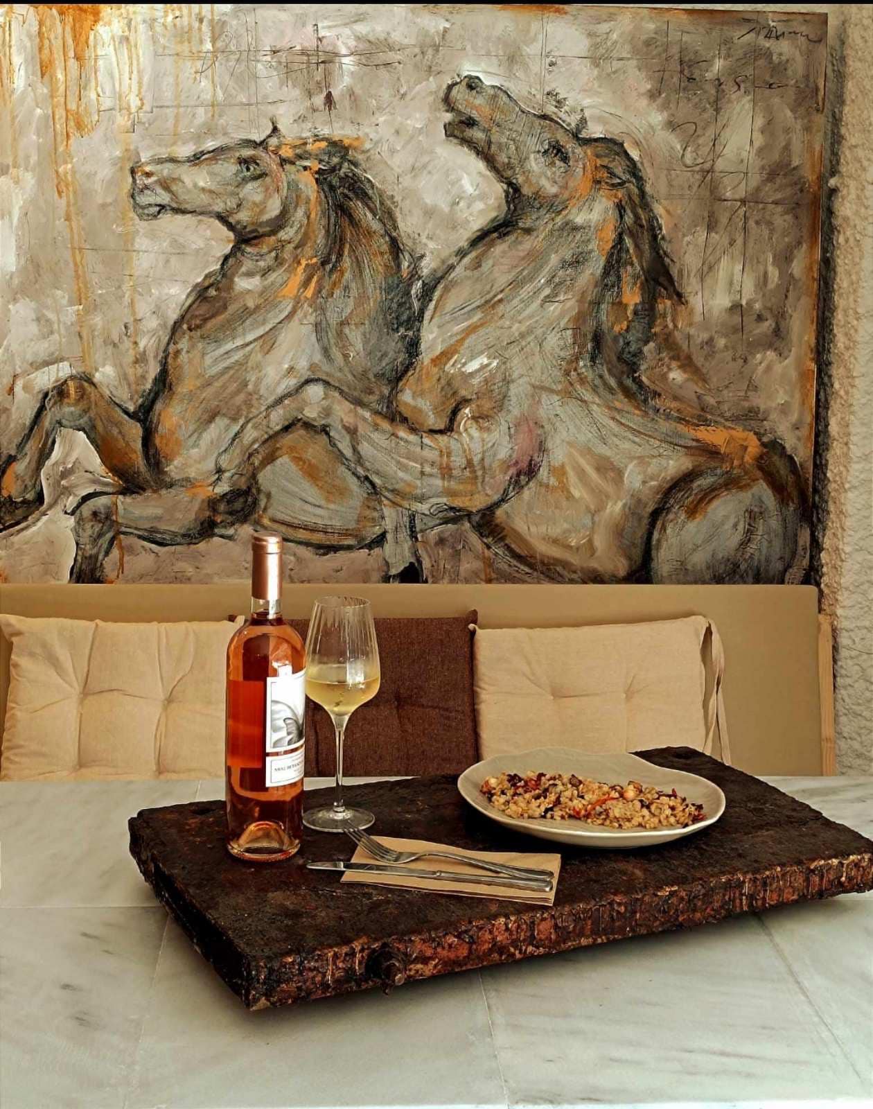 Με vintage διάθεση -χειροποίητα χαλιά, ξύλινα στοιχεία, σκούρες αποχρώσεις, παλιά διακοσμητικά, γύψινες διακοσμήσεις και βιτρό, σε ταξιδεύει στον χρόνο. Ο ανανεωμένος εξωτερικός χώρος, προσφέρει ανάσες δροσιάς και ησυχίας χάρη στο ιστορικό του πλατάνι.