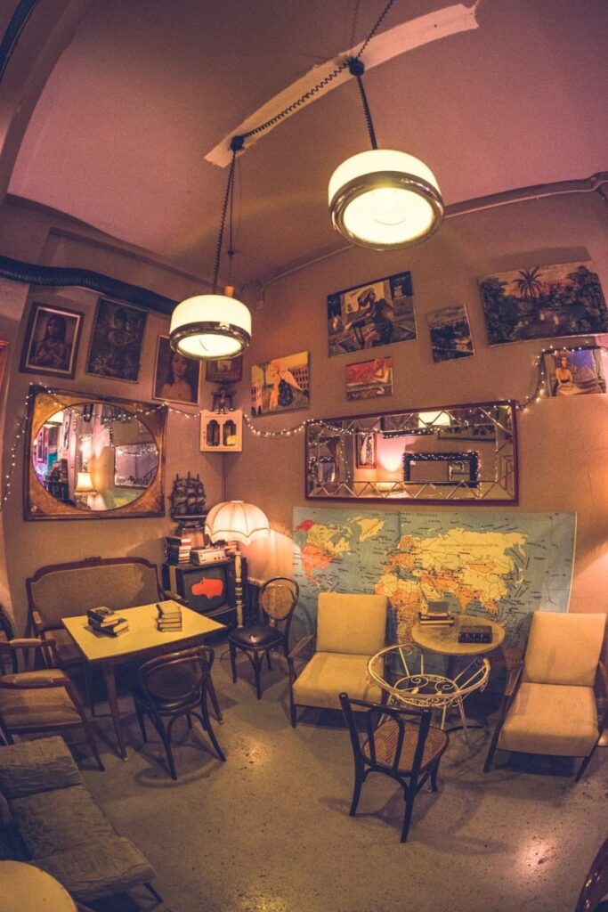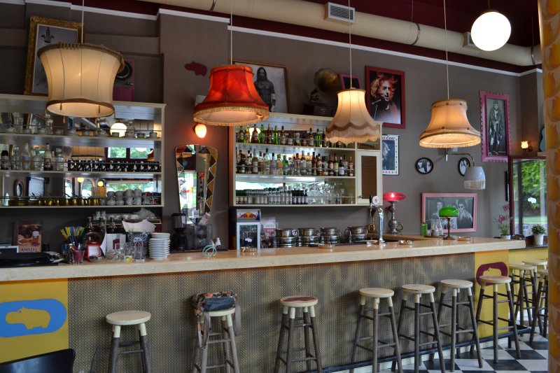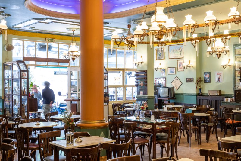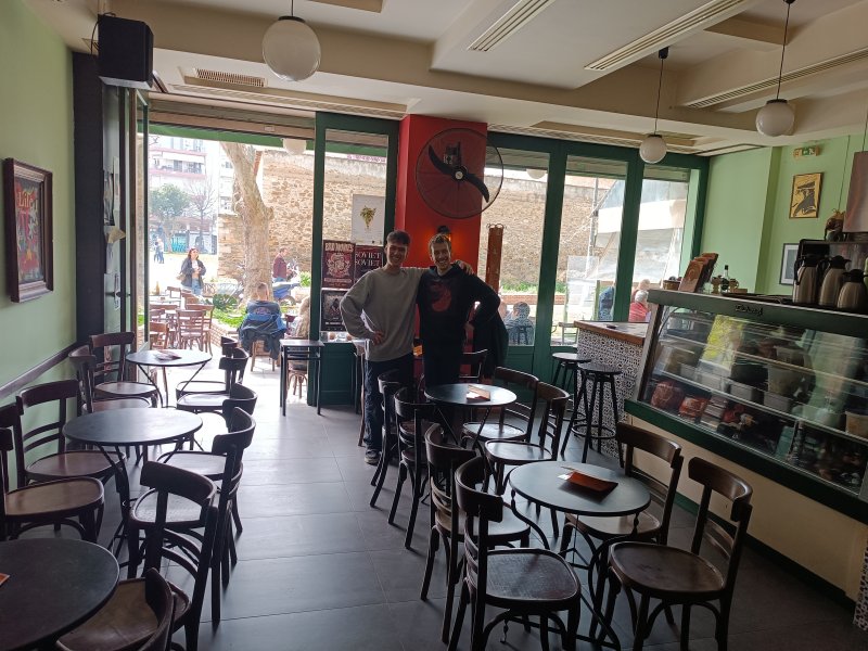 Το καφενείο θα μπορούσε να χαρακτηριστεί άνετα και ως «γκαλερί ροκ ηρώων», με τον προτζέκτορα να προβάλλει διαδοχικά 5.000 φωτογραφίες από ροκ σταρ και μοντέλα, που εναλλάσσονται. Εδώ, από το πρωί μαμάδες και παιδιά συναντιούνται στην πλατεία – με ηλικιωμένους που απολαμβάνουν τον ήλιο, τα μεσημέρια παίρνουν σειρά οι φοιτητές για τον πρώτο καφέ, ενώ το βράδυ, μπορείς να απολαύσεις τη μουσική, με μια μπίρα ή κρασί στο χέρι.