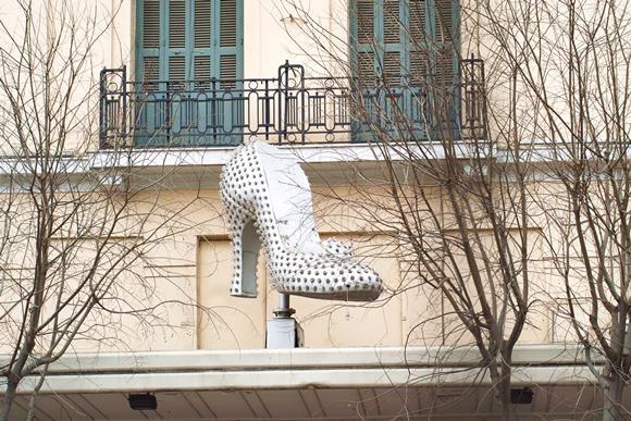 Κάπως ανήσυχο και σίγουρα «περπατηµένο», το επονοµαζόµενο «παπούτσι του Καρύδα» στροβιλίζεται δίνοντας µια glam νότα στην πόλη. Ταξίδεψε από –πού αλλού;– το Λας Βέγκας, όπου κατασκευάστηκε από την εταιρία Yesco, µε αεροπλάνο µέχρι την Αθήνα και έπειτα µε τρένο µέχρι το σταθµό του, την οδό Εγνατίας 52, στέγη τότε του καταστήµατος υποδηµάτων Καρύδας. Έκτοτε ξαφνιάζει και εντυπωσιάζει τους διαβάτες του κέντρου, µέχρι και το γάλλο Πρόεδρο Ζισκάρ ντ΄Εστέν, που το φωτογράφησε το 1975. Το larger than life παπούτσι κοντεύει τα δύο µέτρα σε συνολικό ύψος και τα δυόµισι σε µήκος και πάνω του καµαρώνουν 780 λαµπάκια. Κοιτώντας το, θυµάται κανείς την ηµέρα που το πρωτοαντίκρυσε, όταν το γοβάκι τού ψιθύρισε πως ο κόσµος µερικές φορές είναι όντως µαγικός. Θεωρείται, πλέον, διατηρητέο µνηµείο, ενώ σήµερα, και παρά το τακούνι ύψους 150 πόντων που το κοσµεί, ισορροπεί σ’αυτό µε άνεση το κατάστηµα της Fena στην Εγνατία.
