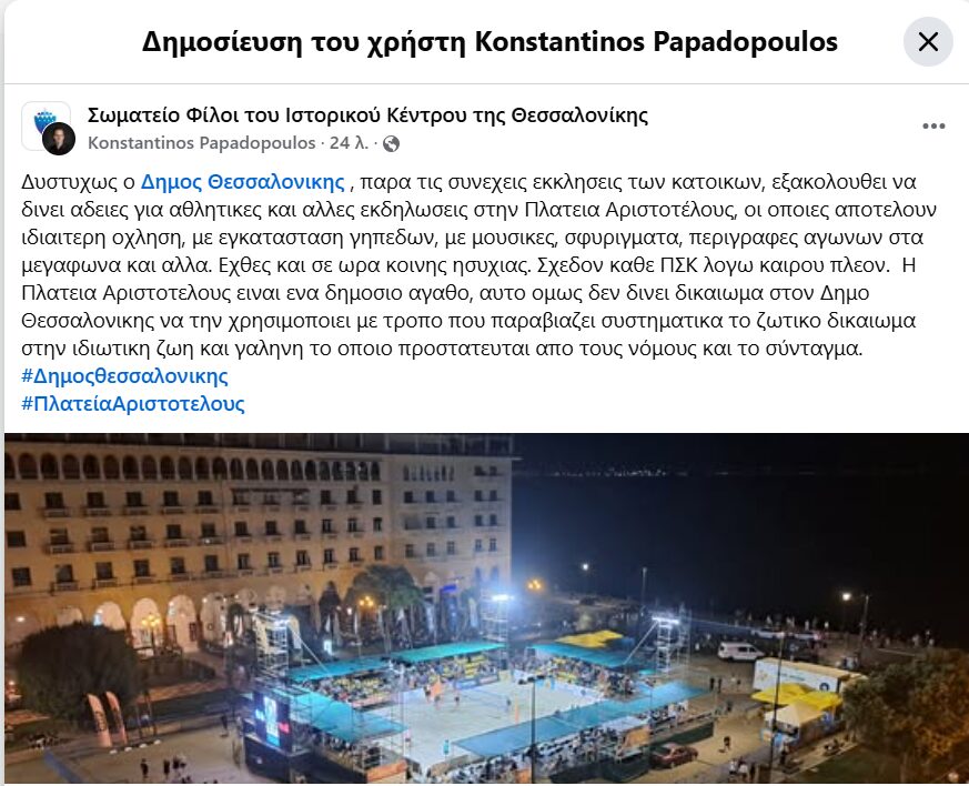 «Δυστυχως ο Δημος Θεσσαλονικης , παρα τις συνεχεις εκκλησεις των κατοικων, εξακολουθει να δινει αδειες για αθλητικες και αλλες εκδηλωσεις στην Πλατεια Αριστοτέλους, οι οποιες αποτελουν ιδιαιτερη οχληση, με εγκατασταση γηπεδων, με μουσικες, σφυριγματα, περιγραφες αγωνων στα μεγαφωνα και αλλα. Εχθες και σε ωρα κοινης ησυχιας. Σχεδον καθε ΠΣΚ λογω καιρου πλεον. Η Πλατεια Αριστοτελους ειναι ενα δημοσιο αγαθο, αυτο ομως δεν δινει δικαιωμα στον Δημο Θεσσαλονικης να την χρησιμοποιει με τροπο που παραβιαζει συστηματικα το ζωτικο δικαιωμα στην ιδιωτικη ζωη και γαληνη το οποιο προστατευται απο τους νόμους και το σύνταγμα».
