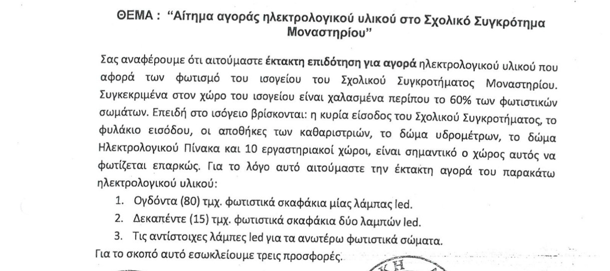 - Τα υλικά επισκευής βρίσκονται στο φυλάκιο του σχολικού συγκροτήματος. Ωστόσο θα επισημάνω ότι η εύρεση των υλικών έγινε με πρωτοβουλία του σχολείου και όχι με επισήμανση των τεχνιτών του δήμου ως όφειλαν αυτοί. Σας αναφέρουμε ότι σε πολλές περιπτώσεις οι τεχνίτες έρχονται να εντοπίσουν μια βλάβη και αποχωρούν χωρίς να καταθέσουν μια λίστα υλικών που πρέπει να αγοραστούν από το σχολείο για γίνει η επισκευή. Το σχολείο δεν διαθέτει τις απαραίτητες γνώσεις εύρεσης τέτοιων υλικών αν αυτά δεν επισημανθούν από αρμόδιους τεχνίτες».