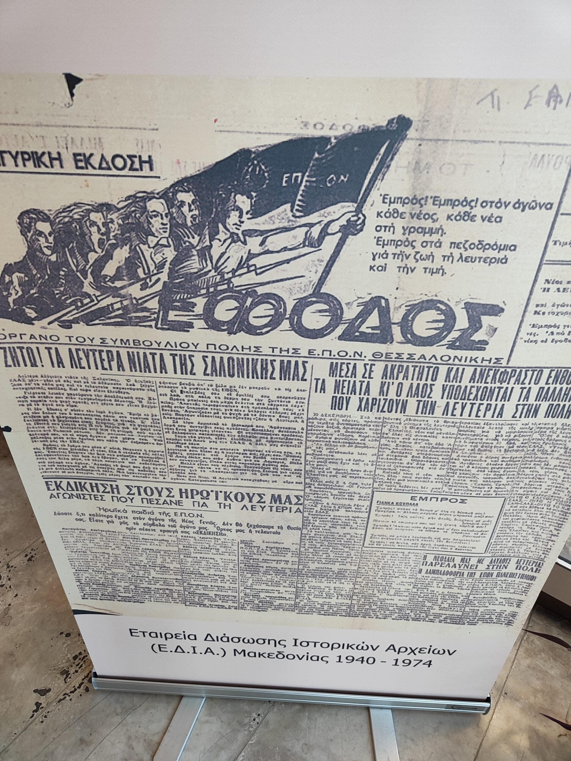 Ξεκινώντας τη περιήγηση μας από τη δεξιά πλευρά της έκθεσης, το μάτι μας πέφτει στο πανηγυρικό πρωτοσέλιδο της έκδοσης της εφημερίδας «ΕΦΟΔΟΣ», όργανο του συμβουλίου πόλης της ΕΠΟΝ Θεσσαλονίκης.