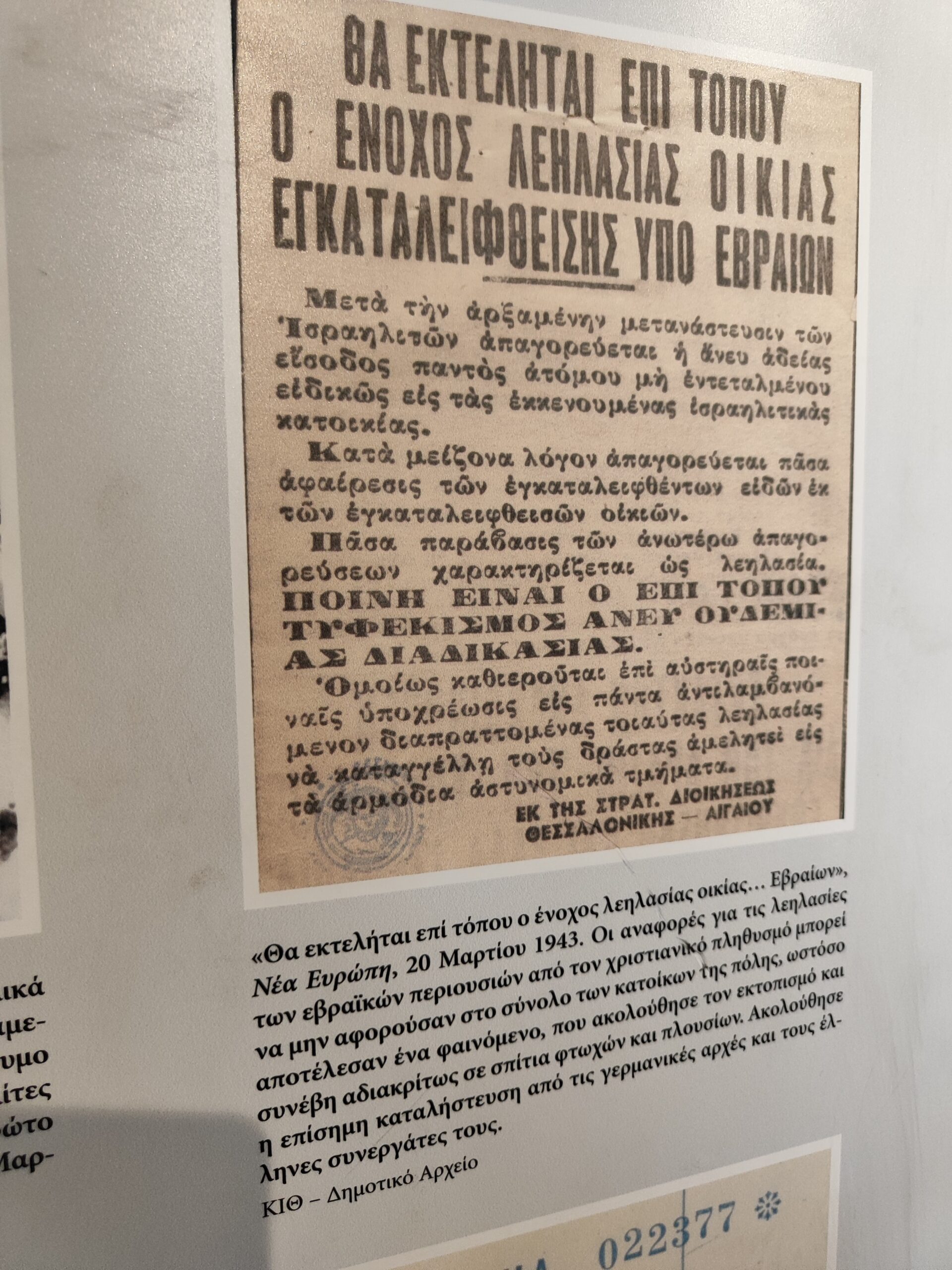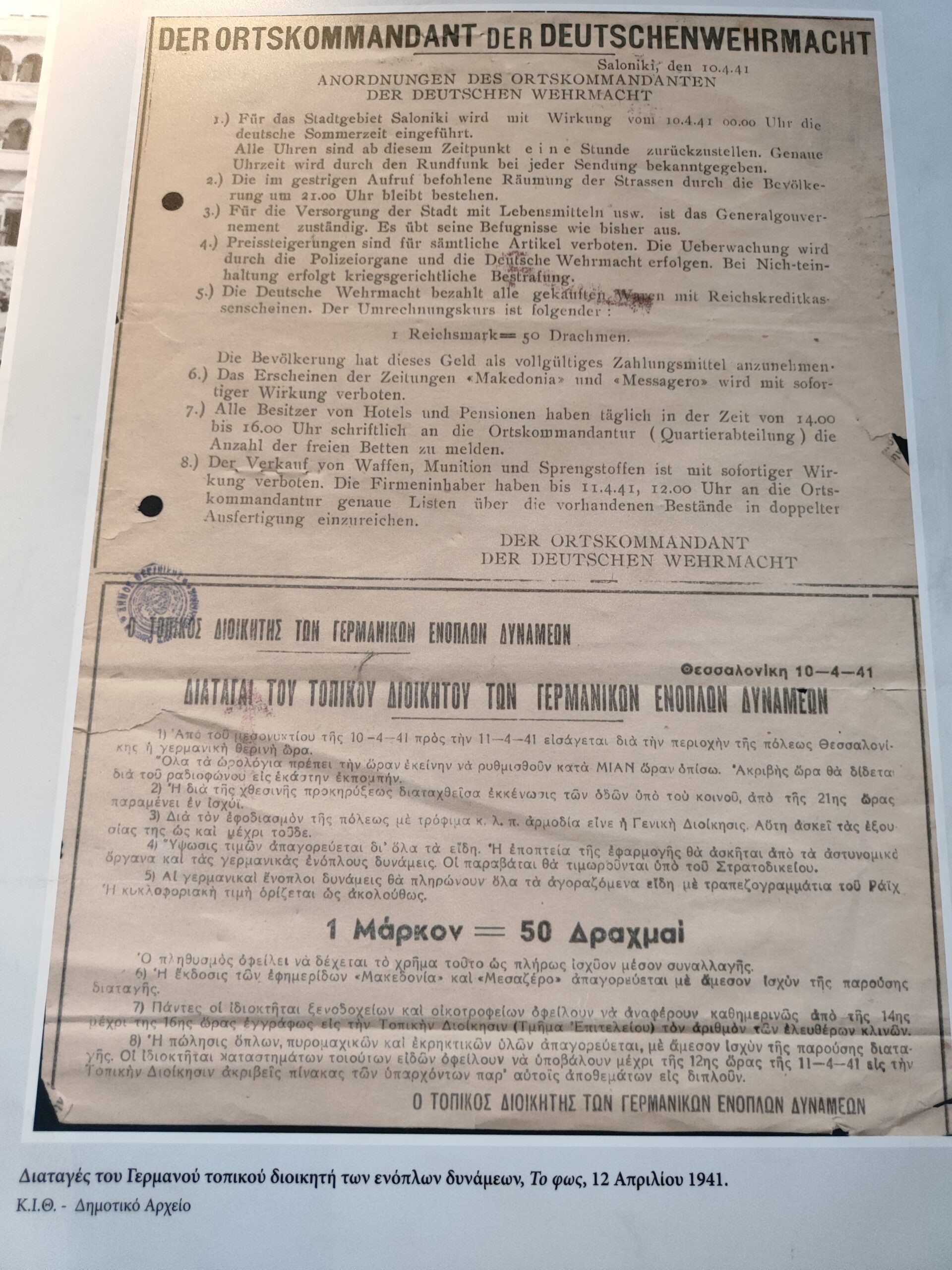 Μια ιδιαίτερα ενδιαφέρουσα έκθεση ντοκουμέντων της περιόδου της γερμανικής κατοχής και της απελευθέρωσης της Θεσσαλονίκης από τους Ναζί λειτουργεί έως και τις 18 Νοεμβρίου στο Κέντρο Αρχιτεκτονικής του Δήμου Θεσσαλονίκης (Αγγελάκη 13).
