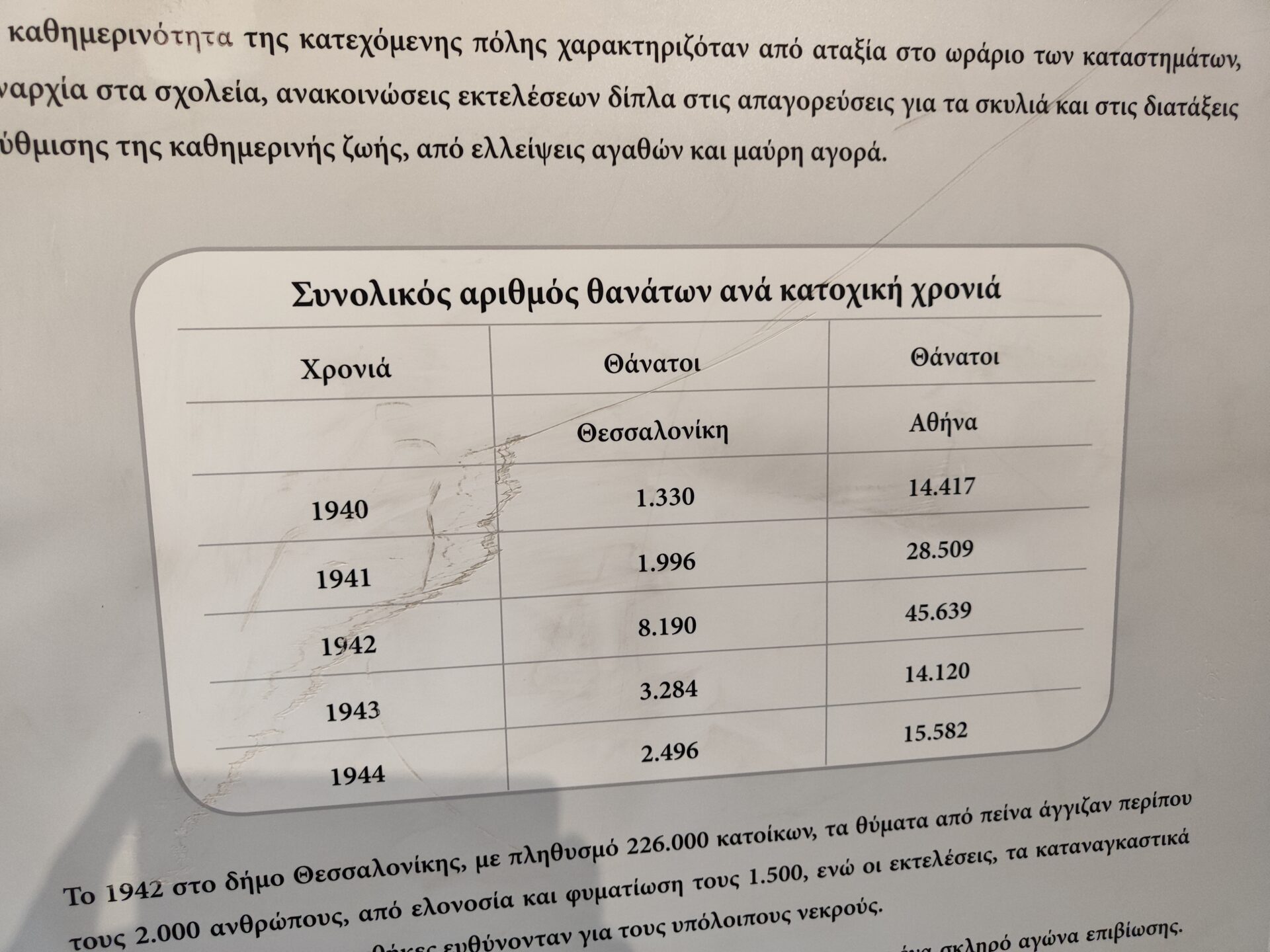Το 1942 στο δήμο Θεσσαλονίκης με πληθυσμό 226.000 κατοίκους τα θύματα από πείνα αγγίζουν περίπου τους 2.000 ανθρώπους, από ελονοσία και φυματίωση τους 1.500, ενώ οι εκτελέσεις, τα καταναγκαστικά έργα και οι δύσκολες συνθήκες ευθύνονταν για τους υπόλοιπους νεκρούς.
