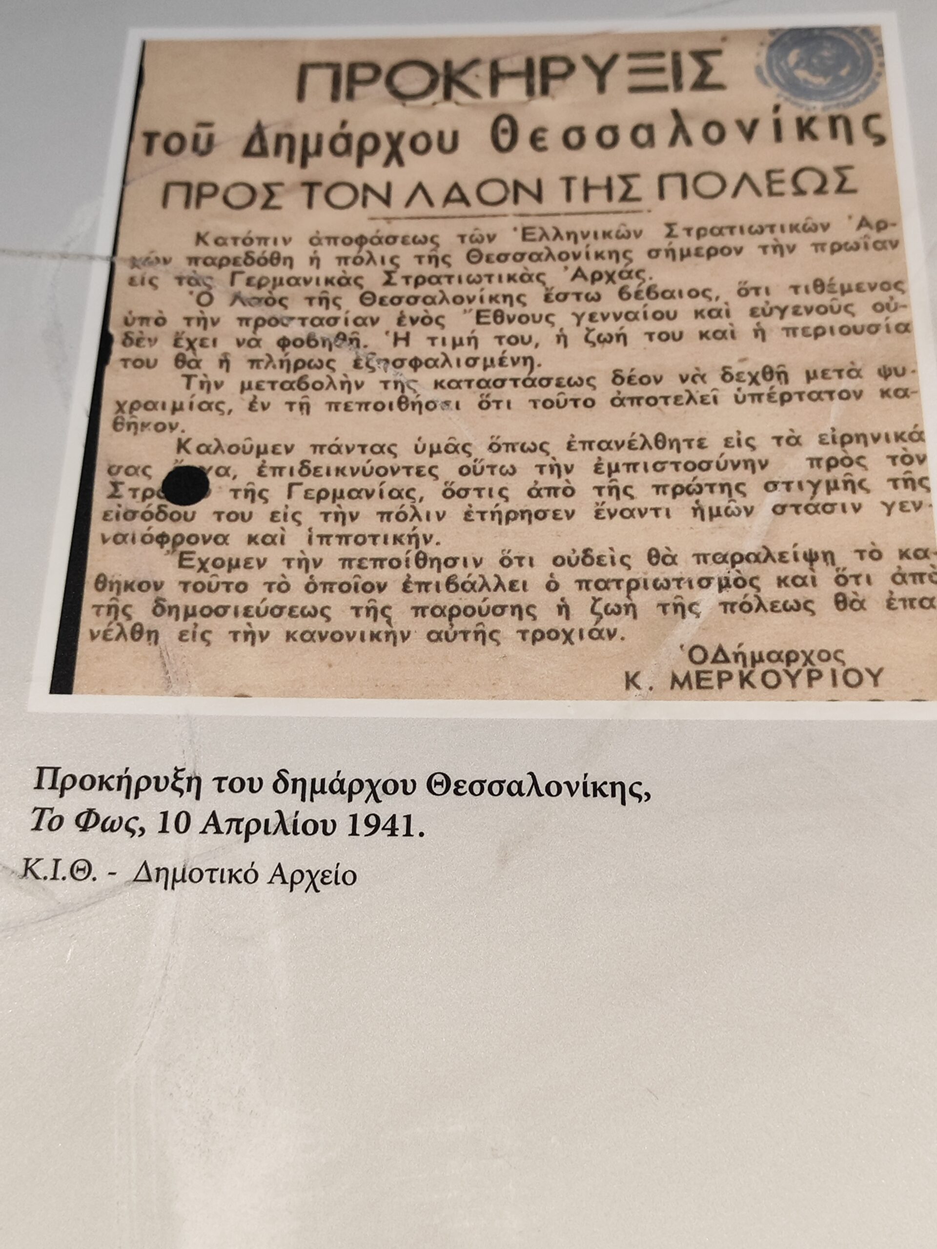 Ο δήμαρχος δήλωνε ότι παραδίδει την πόλη προς τον Γερμανό στρατηγό ύστερα από τις στρατιωτικές εξελίξεις «με τη βαθειά πεποίθησιν ότι η εν γένει ασφάλεια και η ησυχία αυτής θα είναι ηγγυημένοι και ο βίος των πολιτών ομαλός και άνετος».