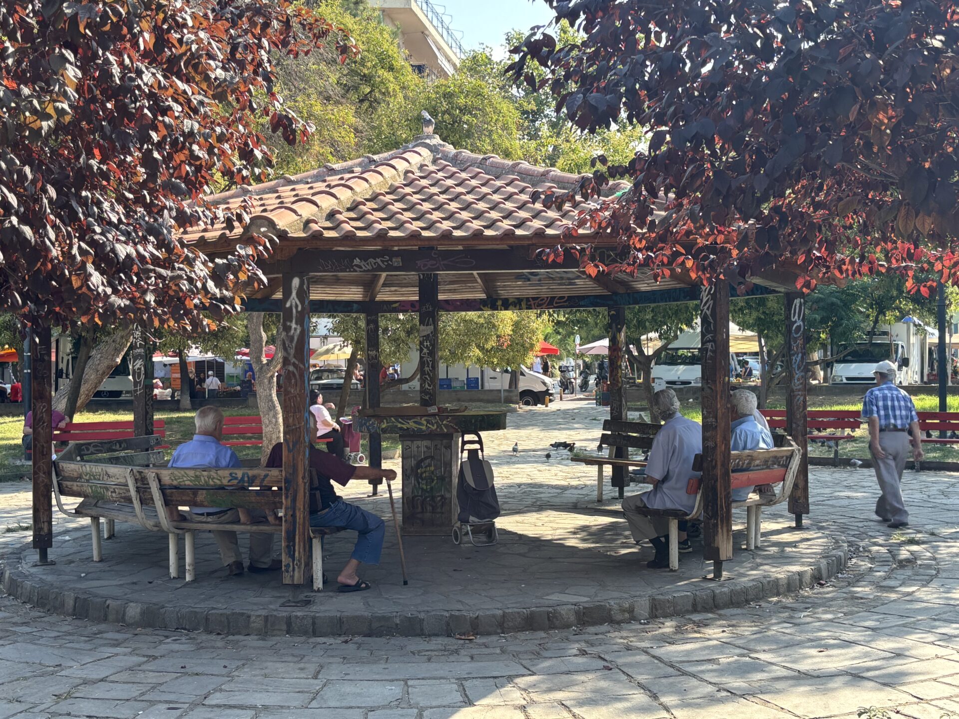 Σε μερικά σημεία της πόλης, σε σταθερά παγκάκια και κάποια κιόσκια που προσφέρουν σκιά, οι ηλικιωμένοι βρίσκουν εκεί την άνεσή τους και τα μετατρέπουν σε υπαίθρια καφενεία.