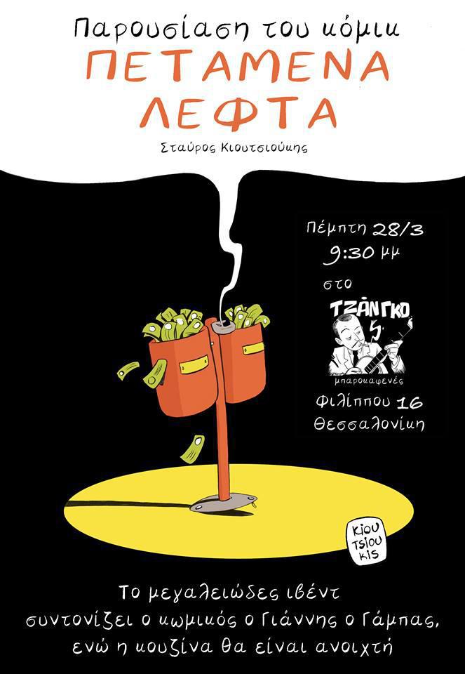Το νέο του βιβλίο είναι αυτοέκδοση και ο ίδιος μας σχολίασε γι αυτό: “ΠΕΤΑΜΕΝΑ ΛΕΦΤΑ. Είναι το…χάνω τον αριθμό εγχείρημα της zart_corps, της άτυπης εκδοτικής υπό το όνομα της οποίας “εκδίδω” τα κόμικ φάνζινς μου τα τελευταία είκοσι χρόνια. Σε αυτό βρίσκεται μεγάλο μέρος της καθημερινής παραγωγής μου σε κόμικ στριπ και σκίτσα κατα την τελευταία τριετία και που δεν θα ήθελα να “χαθούν” στο ιντερνετικό σύμπαν. Χωρίς άμεση συνοχή εκ πρώτης, κοινό τους σημείο αναφοράς είναι η διαρκής ανάγκη μου να μοιραστώ με τον κόσμο γύρω μου αστείες ιδέες φιλτραρισμένες μέσα από την εικόνα. Και να είσαστε σίγουροι πως δεν πετάτε τα λεφτά σας!”