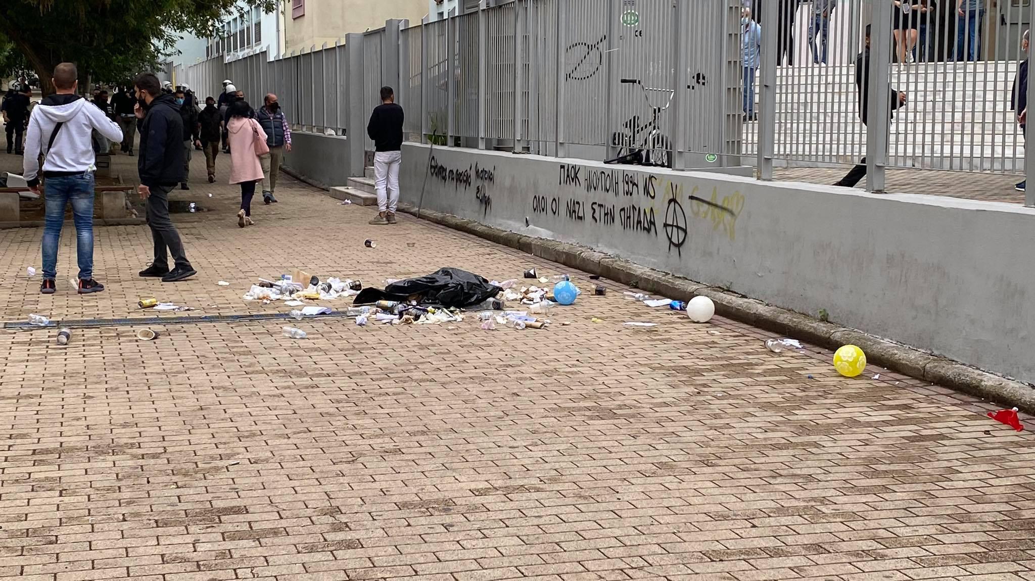 Μαθητές μέσα από το σχολείο άρχισαν να πετούν φαράσια, κάδους σκουπιδιών και άλλα αντικείμενα στους συγκεντρωμένους έξω από αυτό.