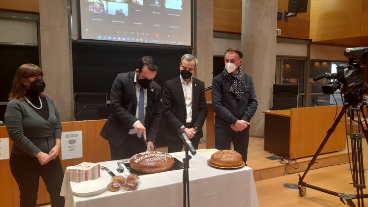 Με την κοπή της πρωτοχρονιάτικης πίτας, παρουσία του Δημάρχου Θεσσαλονίκης Κωνσταντίνου Ζέρβα, ξεκίνησε η αποψινή συνεδρίαση του Δημοτικού Συμβουλίου Θεσσαλονίκης.