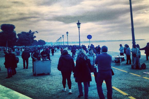 Έντεκα και κάτι. Η τροχαία μόλις έχει κλείσει το δρόμο για τα αυτοκίνητα. Κάτι ξεχασμένα μηχανάκια βιαστικά διασχίζουν την παραλιακή. Ο κόσμος μοιάζει να περίμενε το σύνθημα. Κατεβαίνουν στη μέση του οδοστρώματος. Ξεχύνονται από όλους τους κάθετους δρόμους. Νεαρά ζευγάρια με καρότσια, παιδιά με ποδήλατα, ηλικιωμένοι. Χιλιάδες. Λιγότερο περίεργοι από τις προηγούμενες φορές της πιλοτικής πεζοδρόμησης. Περισσότερο αποφασισμένοι από κάθε φορά. Ο δρόμος τους ανήκει. Η πεζοδρόμηση του Φεβρουαρίου, η τέταρτη στη σειρά, έχει προηγηθεί το φθινόπωρο με μια ανάπαυλα το Γενάρη, ήταν η λιγότερο διαφημισμένη. Μια λιτή ανακοίνωση την Τετάρτη από το νέο αντιδήμαρχο Κωσταντίνο Ζέρβα και την τροχαία που απλά πληροφορούσε ότι η παλιά παραλία θα έκλεινε την Κυριακή.