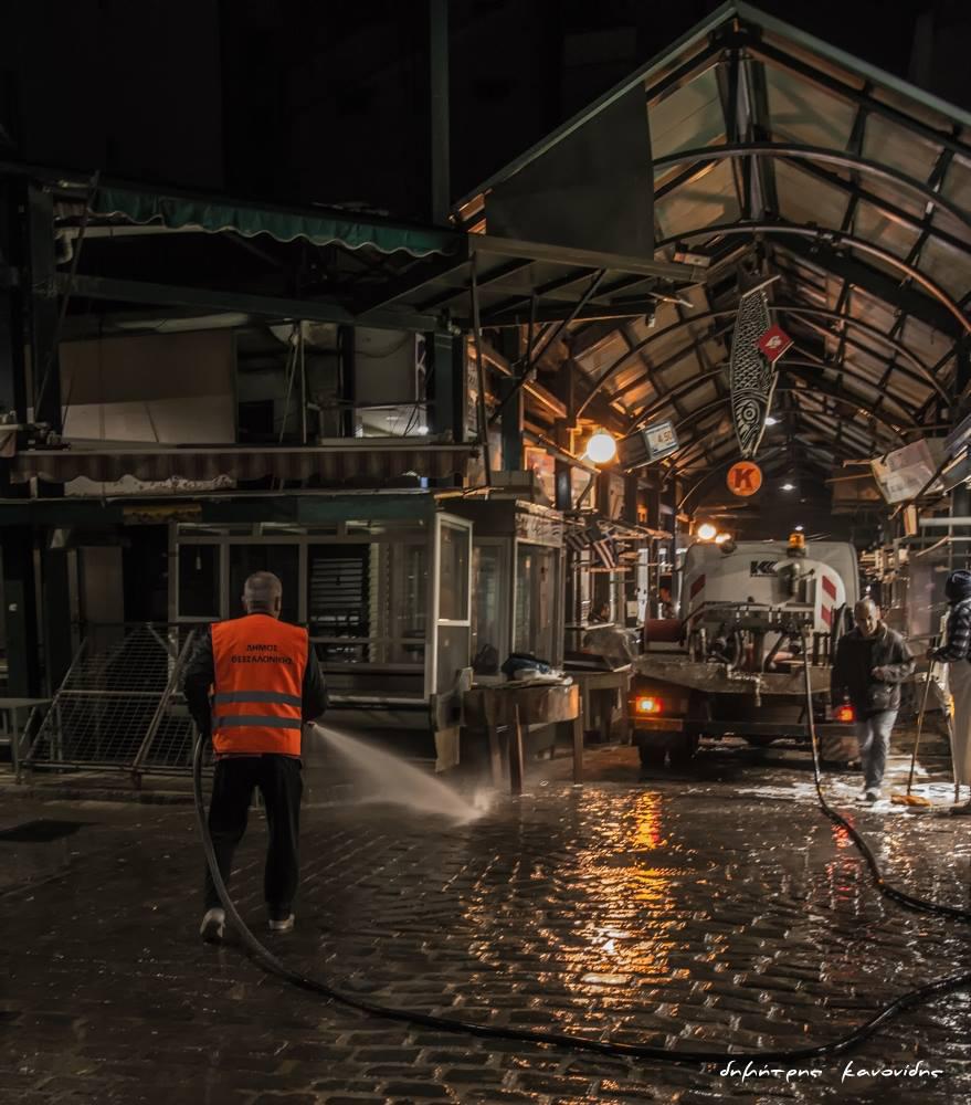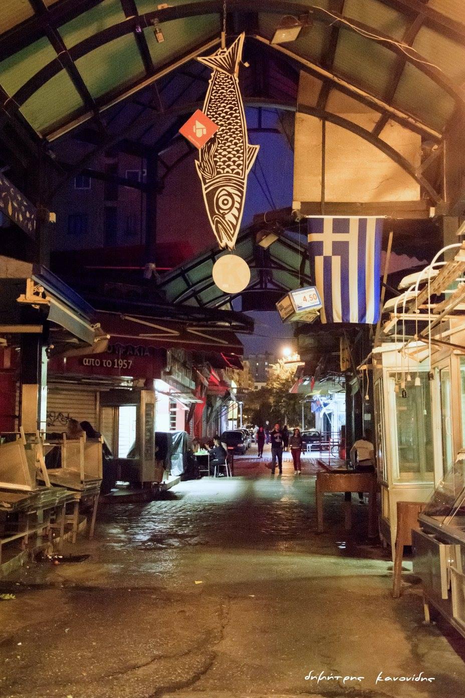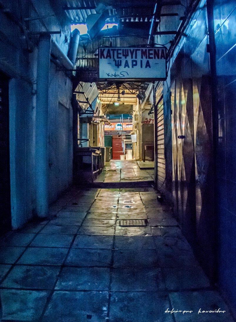 Όταν πέφτει η νύχτα, και το πολύβουο μελίσσι αυτής της αγοράς εξαφανίζεται, στην ερημιά των πάγκων και των κατεβασμένων κεπεγκιών, η απουσία γίνεται σκηνικό. Οι βρεγμένοι από τις μάνικες δρόμοι γίνονται τοπία υγρής μοναξιάς, οι ελάχιστοι βιαστικοί διαβάτες μέρος της ερημιάς. Η αγορά της πόλης ζει στο φως της μέρας και κοιμάται όταν η πόλη παίρνει τη νυχτερινή φωτιά της. Μοδιάνο-Καπάνι, η άλλη όψη.