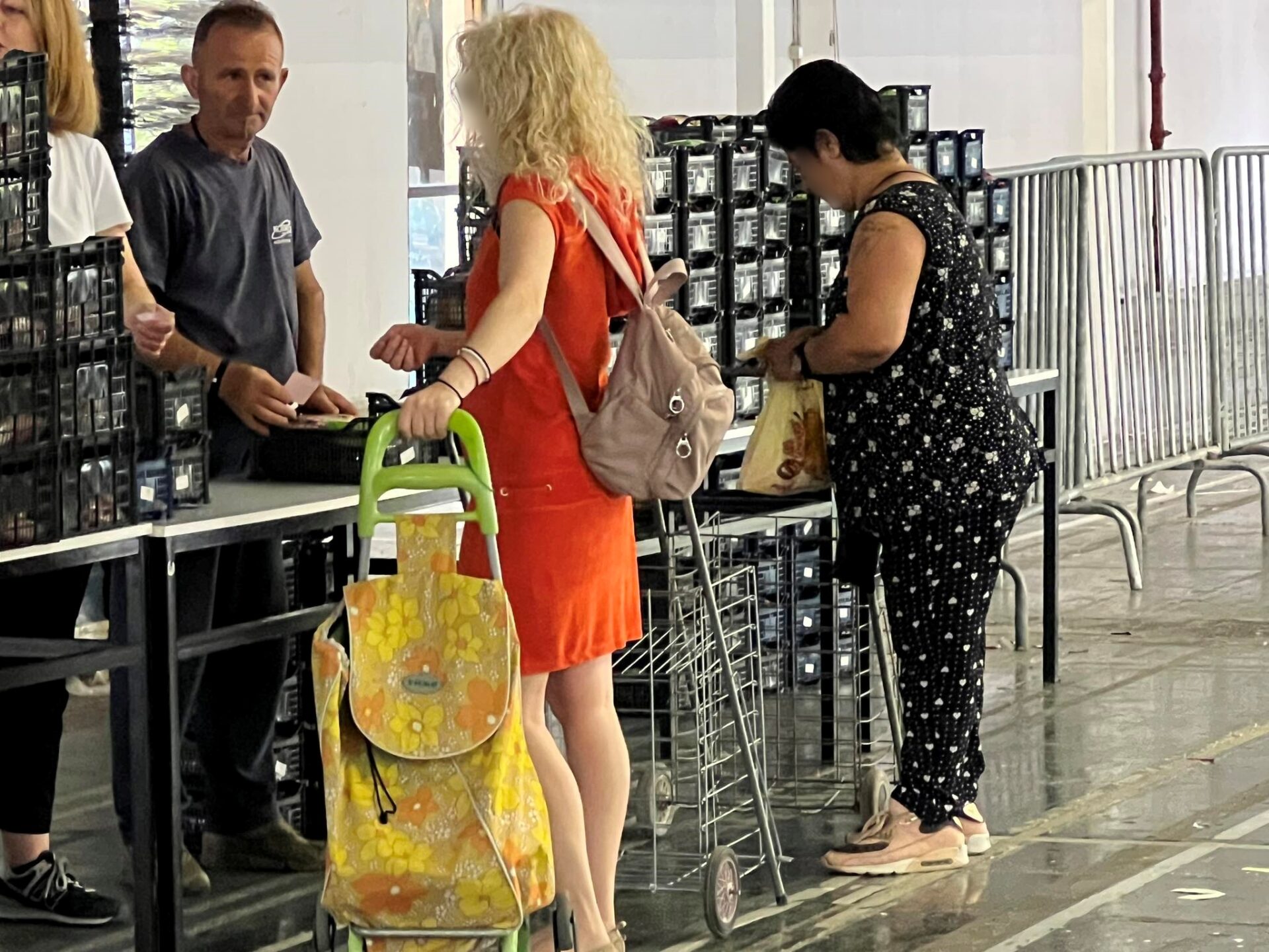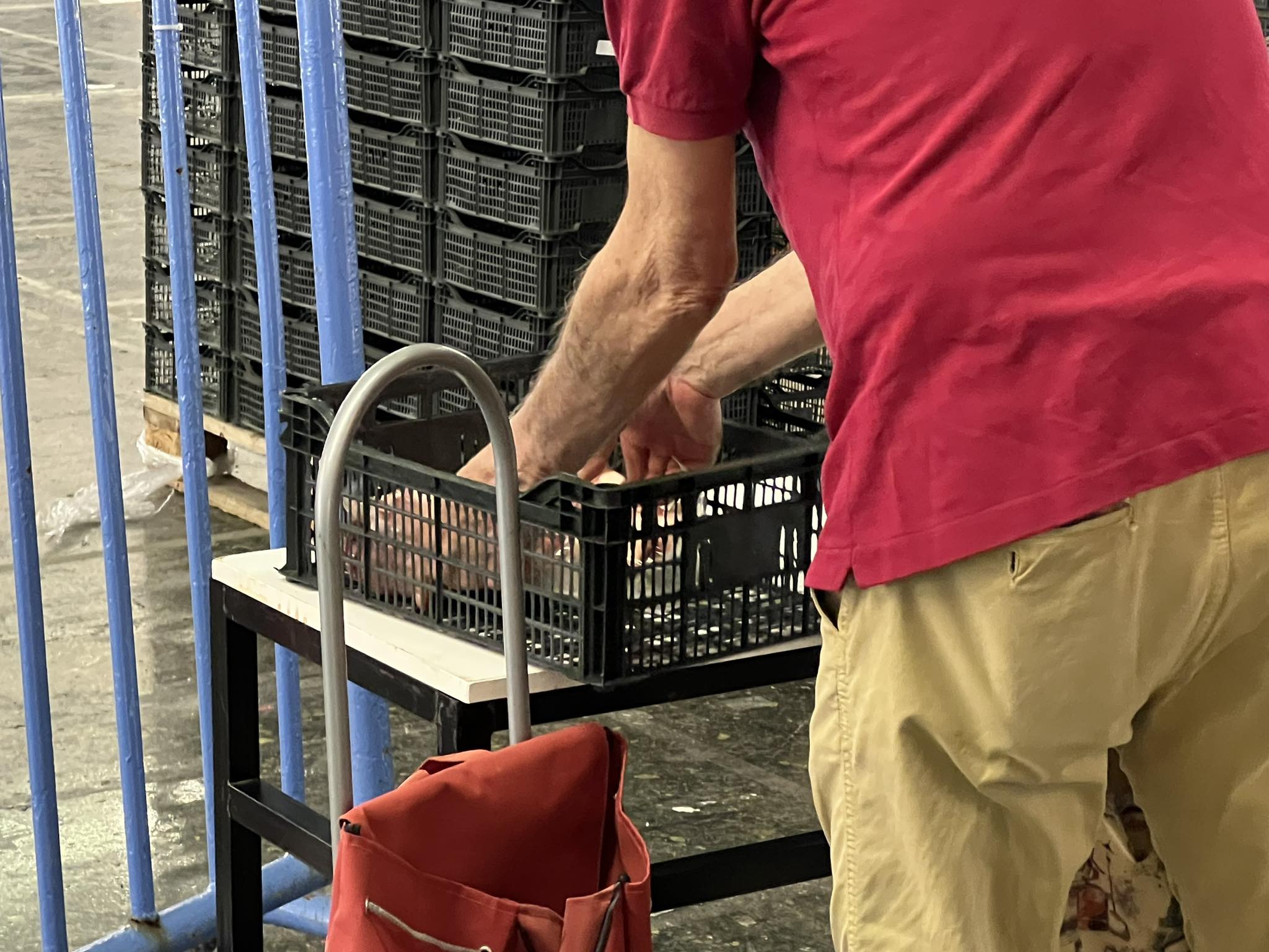 Ένας άλλος κύριος, έχει φέρει το καρότσι που χρησιμοποιεί στην λαϊκή για να το γεμίσει με το τυρί, το κρέας και όλα τα βασικά αγαθά που χρειάζεται. Κρατάει τα καλάθια και περνάει στην απέναντι πλευρά για να τα τακτοποιήσει, όπως επιθυμεί.
