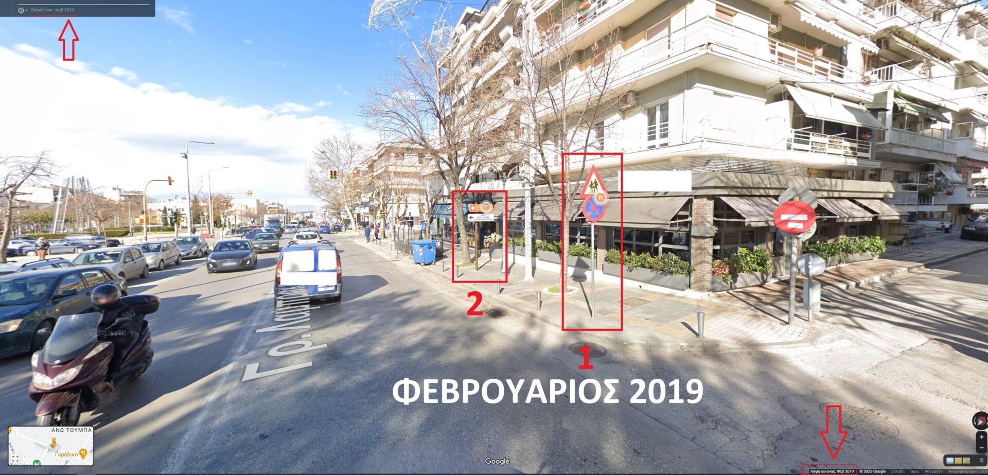 Στην πρώτη φωτογραφία που πάρθηκε από το google street view (τραβηγμένη το Φεβρουάριο του 2019) φαίνονται καθαρά δύο πινακίδες σήμανσης επί της οδού Γρηγορίου Λαμπράκη.