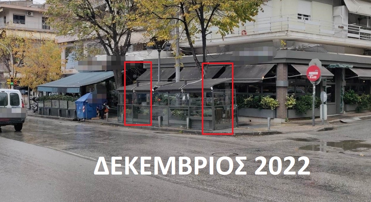 Στη δεύτερη, τραβηγμένη στις 5/12/2022, οι πινακίδες λείπουν και στη θέση τους υπάρχουν τραπεζοκαθίσματα.