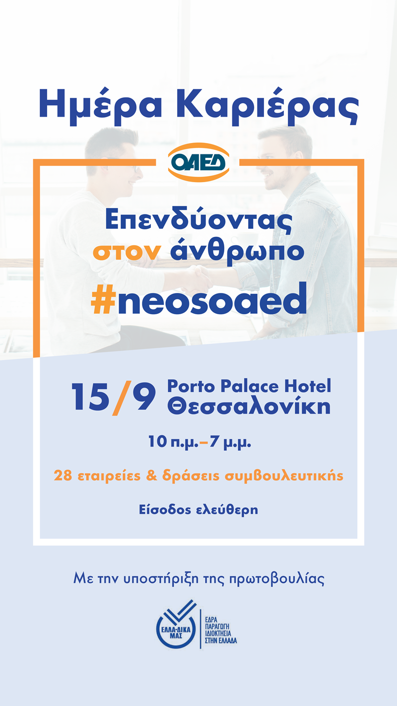 Στις 15 Σεπτεμβρίου στη Θεσσαλονίκη η πρώτη «Ημέρα Καριέρας ΟΑΕΔ» με την υποστήριξη της πρωτοβουλίας ΕΛΛΑ-ΔΙΚΑ ΜΑΣ