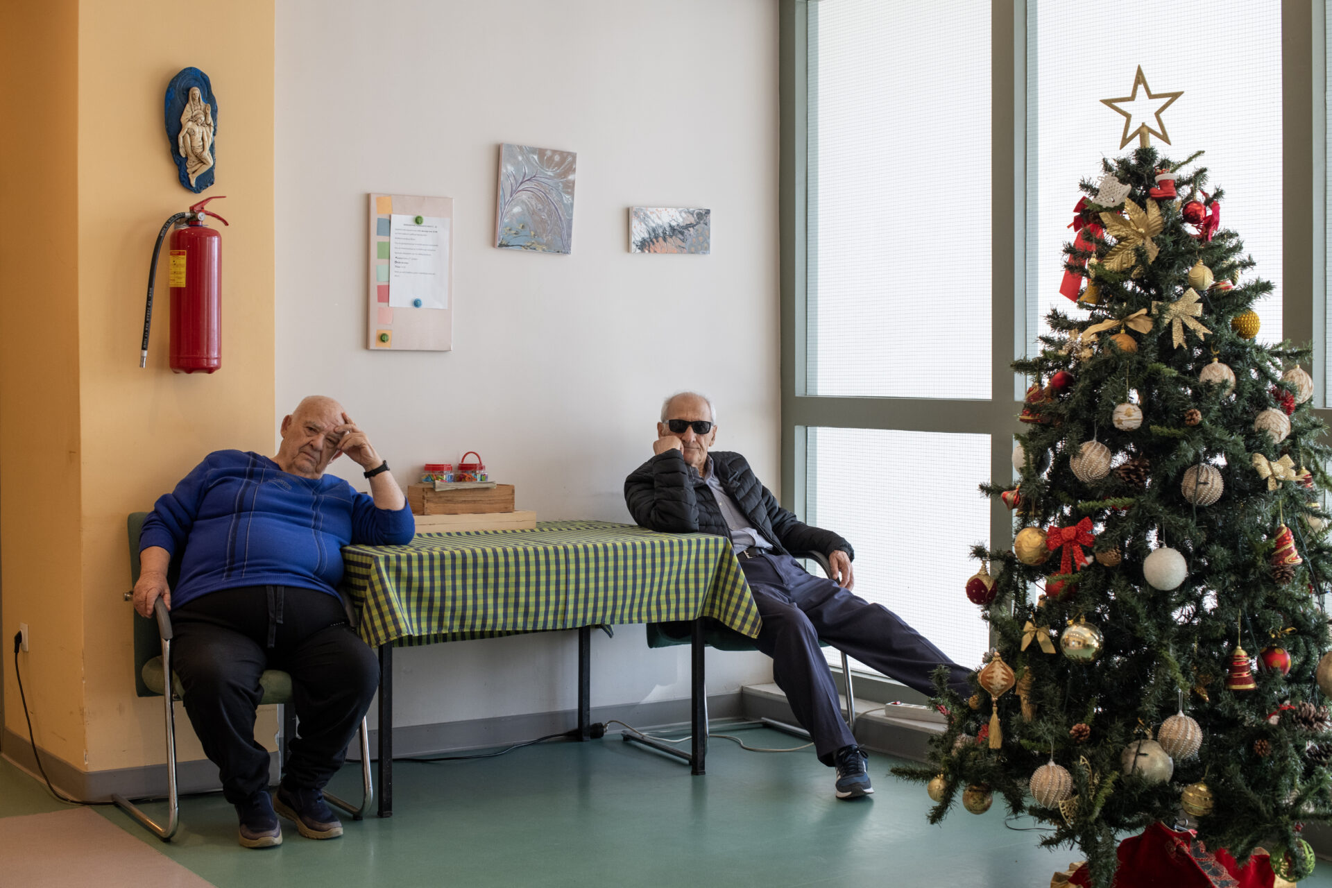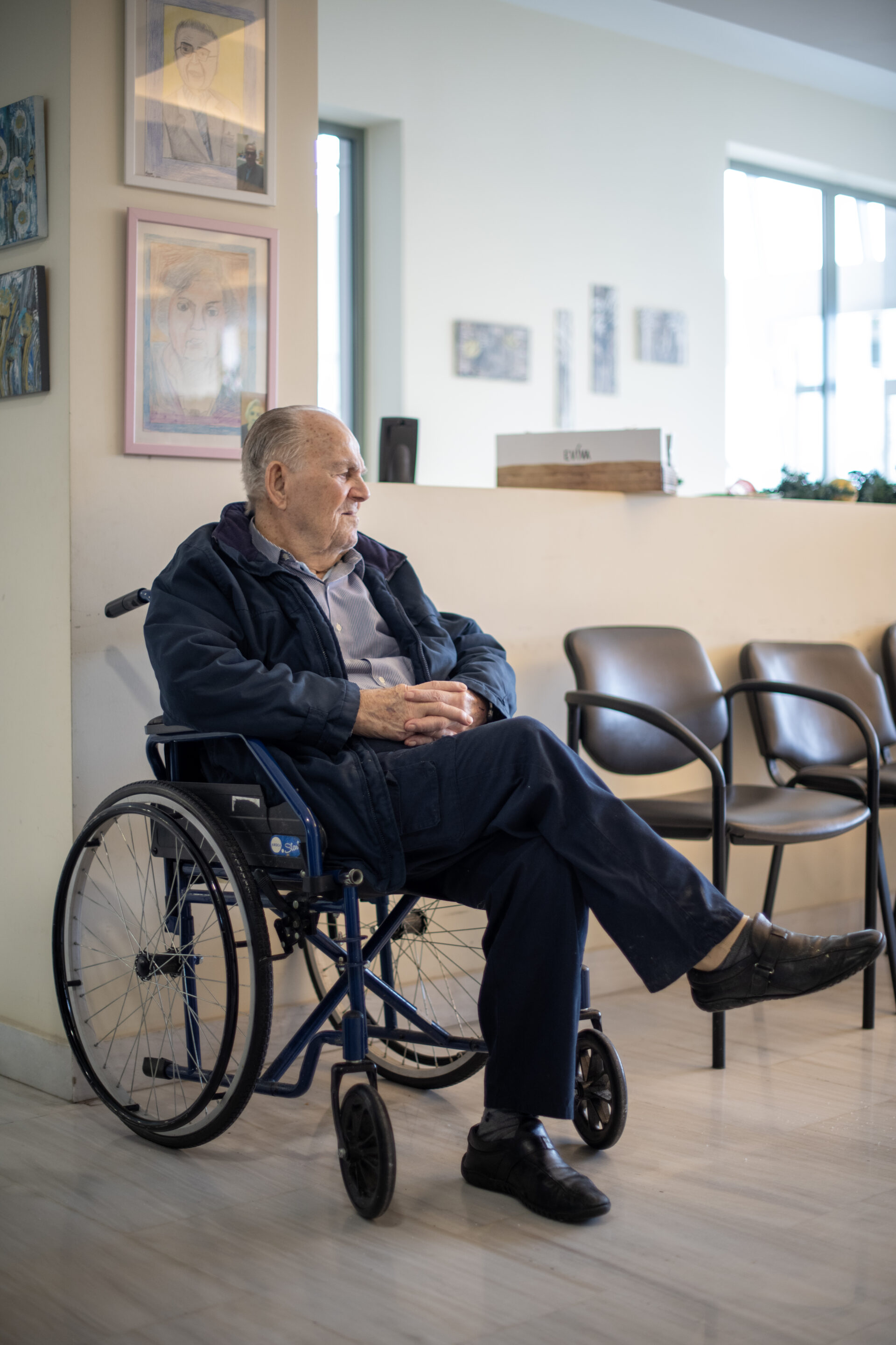 Ο κύριος Νίκος κάθεται μπροστά στο τραπέζι του τάβλι πάνω στο αναπηρικό αμαξίδιο. Ο ήχος από τα ζάρια που πέφτουν στο ταμπλό γεμίζει τον χώρο. Οι κινήσεις του είναι αργές αλλά βέβαιες. «Την ημέρα μας την περνάμε με τάβλι, έχουμε καλή παρέα. Οι περισσότεροι εδώ έχουν άνοια, εμείς όμως καλά που ευτυχώς ασχολούμαστε, πότε με το ένα παιχνίδι, πότε με το άλλο. Αυτή είναι η καθημερινότητά μας».