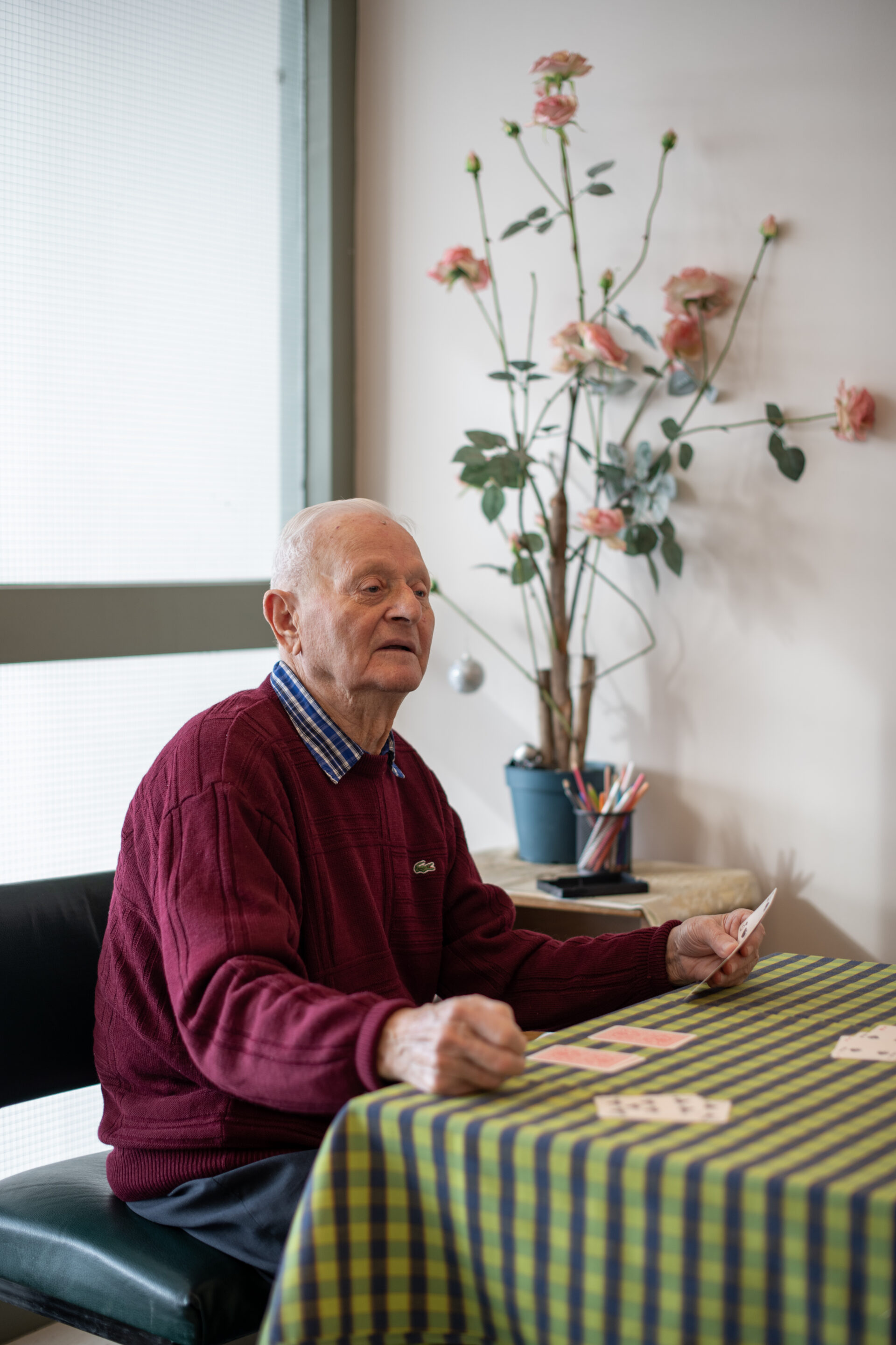 Ο κύριος Γιώργος κάθεται στο τραπέζι με τις τράπουλες απλωμένες μπροστά του. Τα δάχτυλά του κινούνται αργά – αλλά σίγουρα με σιγουριά. «Παίζουμε χαρτιά… και οι μέρες περνάνε ευχάριστα με την παρέα», λέει, και το βλέμμα του φωτίζεται.