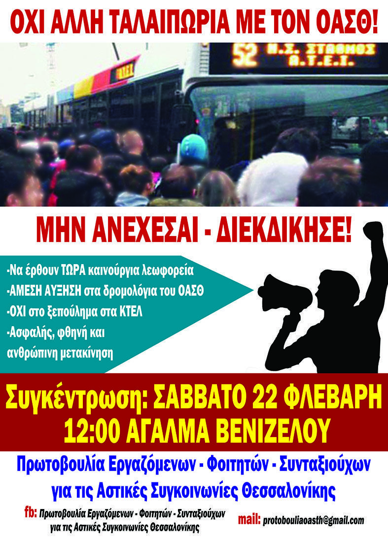 «Καλούμε κάθε εργαζόμενο, άνεργο, νέο, συνταξιούχο, κάτοικο αυτής της πόλης να ξεσηκωθεί και να συμμετέχει ενεργά στις κινητοποιήσεις. Μόνο αν ενώσουμε τη φωνή μας θα ακουστούμε. Ζητάμε να έρθουν καινούργια λεωφορεία, άμεση αύξηση των δρομολογίων σε όλες τις γραμμές, όχι στο ξεπούλημα γραμμών στα ΚΤΕΛ, καμιά αύξηση στις τιμές των εισιτηρίων, ασφαλής, φθηνή και ανθρώπινη μετακίνηση.»