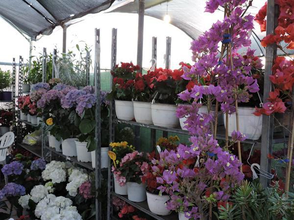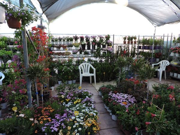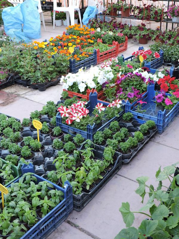 Από εκεί και πέρα, ο καθένας βρίσκει ότι θέλει σε βότανα και αρωματικά φυτά (βασιλικούς απλούς, θάμνους, πλατύφυλλους, θυμάρι, ρίγανη, λεβάντα, θρούμπι, χαμομήλι, κλπ.) και φυσικά, λόγω της εποχής, σε καλλωπιστικό φυτό και λουλούδια. Αμέτρητα γαρύφαλλα – κανονικά και κινέζικα – αμέτρητοι πανσέδες, μολόχες, ζέρμπερες, πετούνιες, μαργαρίτες σε διάφορα χρώματα, ντάλιες… Τα γιασεμιά, σε παρόμοιο ύψος με τις βουκαμβίλιες, αναδύουν τα πιο έντονα αρώματα.