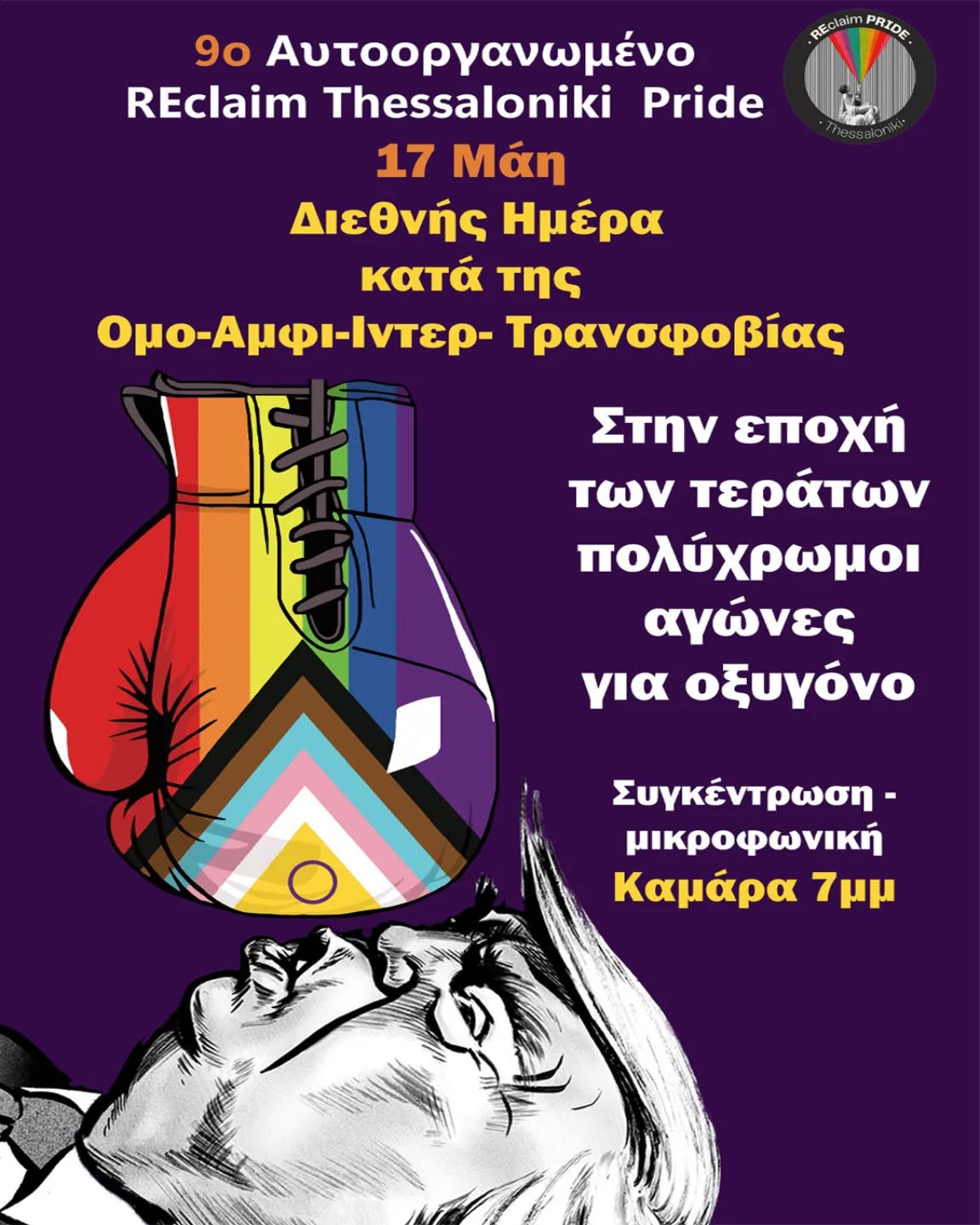 Με αφορμή τη 17η Μαΐου, Παγκόσμια Ημέρα κατά της Ομοφοβίας, Αμφιφοβίας, Τρανσφοβίας και Ιντερφοβίας, το Reclaim Pride Thessaloniki καλεί τον κόσμο σε συγκέντρωση σήμερα στις 19:00 στην Καμάρα.