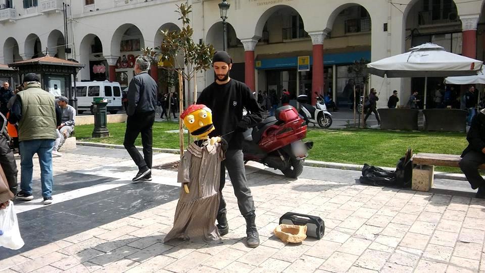 Αυτή την ώρα, ένας νεαρός καλλιτέχνης δρόμου με τη μαριονέτα του ανά χείρας, δίνει χρώμα και δημιουργεί ένα όμορφο κλίμα για τους περαστικούς. Υπό τους ήχους τραγουδιών της Ρένας Βλαχοπούλου, ανανεώνει την ατμόσφαιρα και μας κάνει να χαμογελάσουμε στο διάβα μας.