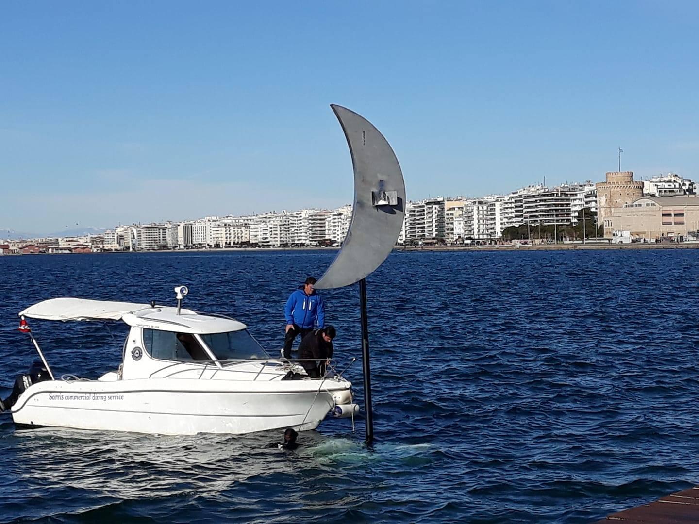 Σήμερα το πρωί ξεκίνησαν στη Νέα Παραλία οι διαδικασίες για την επανατοποθέτηση του «Φεγγαριού» του Παύλου Βασιλειάδη μέσα στη θάλασσα, ανάμεσα στην παλιά του θέση και τις ομπρέλες του Ζογγολόπουλου.
