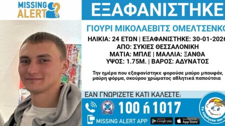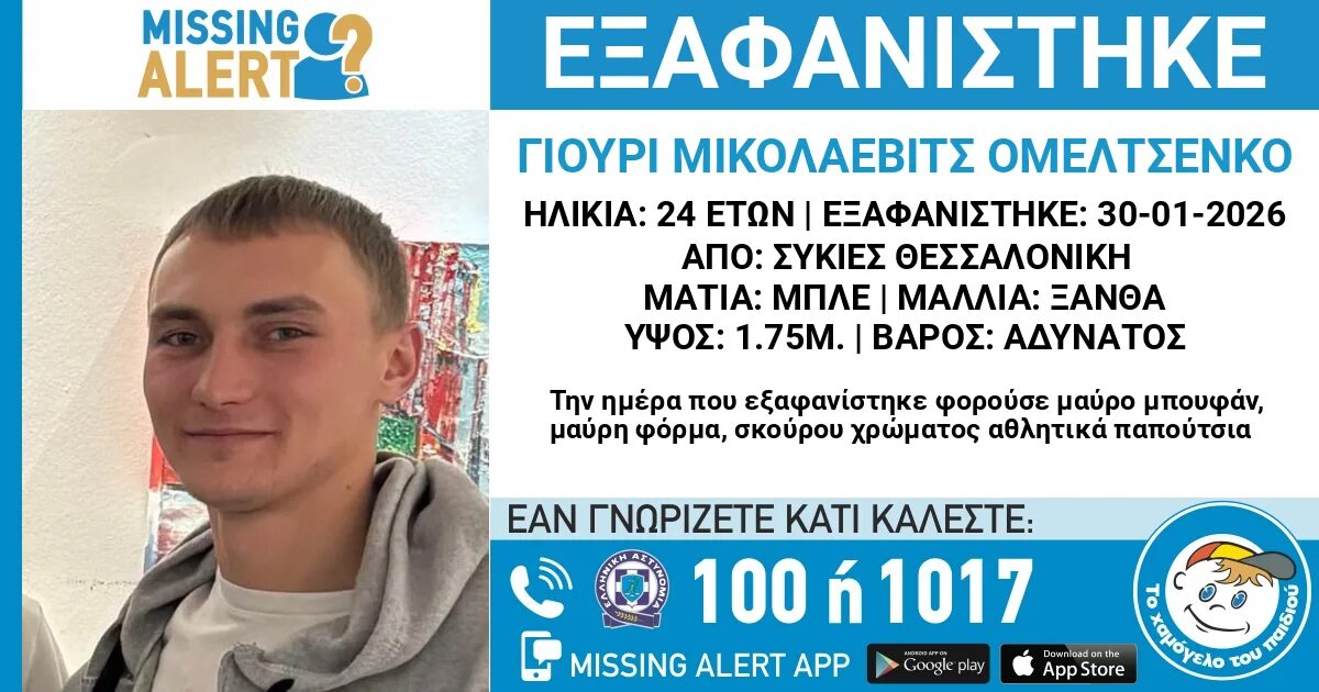 Συναγερμός με την εξαφάνιση του 24χρονου Γιούρι Μικολάεβιτς Ομελτσένκο, από τη Θεσσαλονίκη στις 30 Ιανουαρίου.