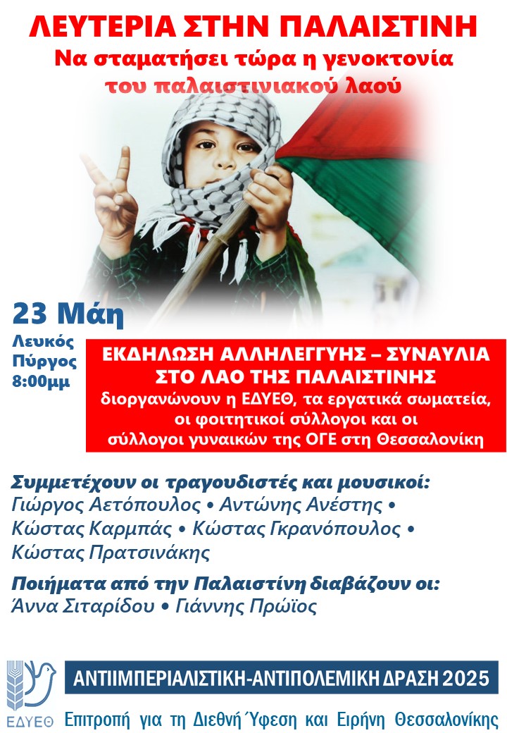 Εκδήλωση – συναυλία συμπαράστασης και αλληλεγγύης στον ηρωικό παλαιστινιακό λαό διοργανώνουν την Παρασκευή 23 Μάη, στις 8 μ.μ. στον Λευκό Πύργο η Επιτροπή για τη Διεθνή Ύφεση και Ειρήνη Θεσσαλονίκης (ΕΔΥΕΘ), τα εργατικά σωματεία και οι φοιτητικοί σύλλογοι της πόλης.
