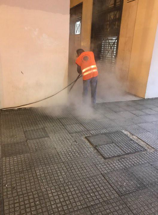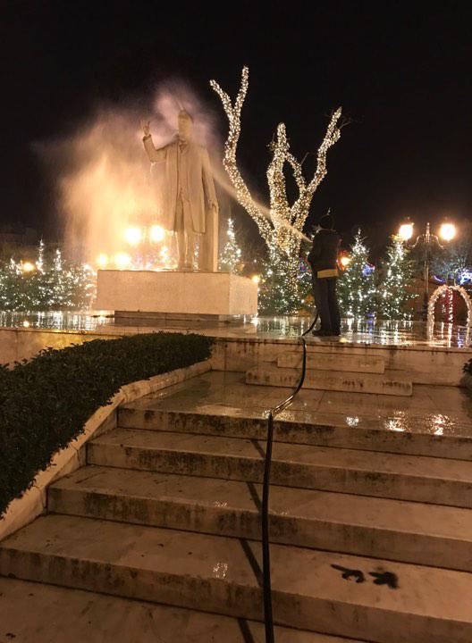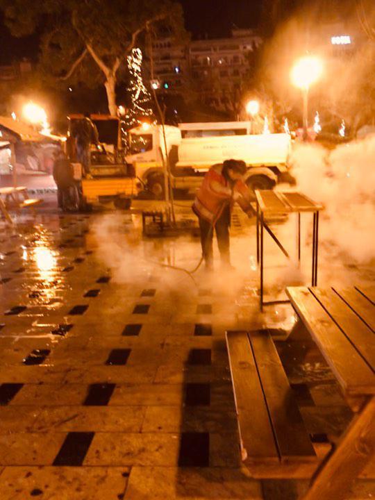 Συγκεκριμένα, μία υδροφόρα με ένα πιεστικό μηχάνημα και πέντε υπάλληλοι με βούρτσες καθάρισαν το πλακόστρωτο.
