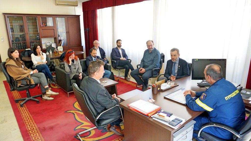 Επισκέφτηκαν το 3ο Πυροσβεστικό Σταθμό όπου και είχαν συνάντηση με τον Συντονιστή Επιχειρήσεων του Αρχηγείου του Π.Σ. με έδρα τη Θεσσαλονίκης, υποστράτηγο κ. Σ. Βαρσάμη και τον Διοικητή Περιφερειακής Διοίκησης Π.Σ. Κεντρικής Μακεδονίας αρχιπύραρχο κ. Κ. Παχίδη. Στα πλαίσια της ενημέρωσης τέθηκαν τα ζητήματα της αντιπυρικής προστασίας της πόλης και ιδιαιτέρως του περαστικού δάσους του Σέιχ Σου αλλά και ζητήματα πολιτικής προστασίας.