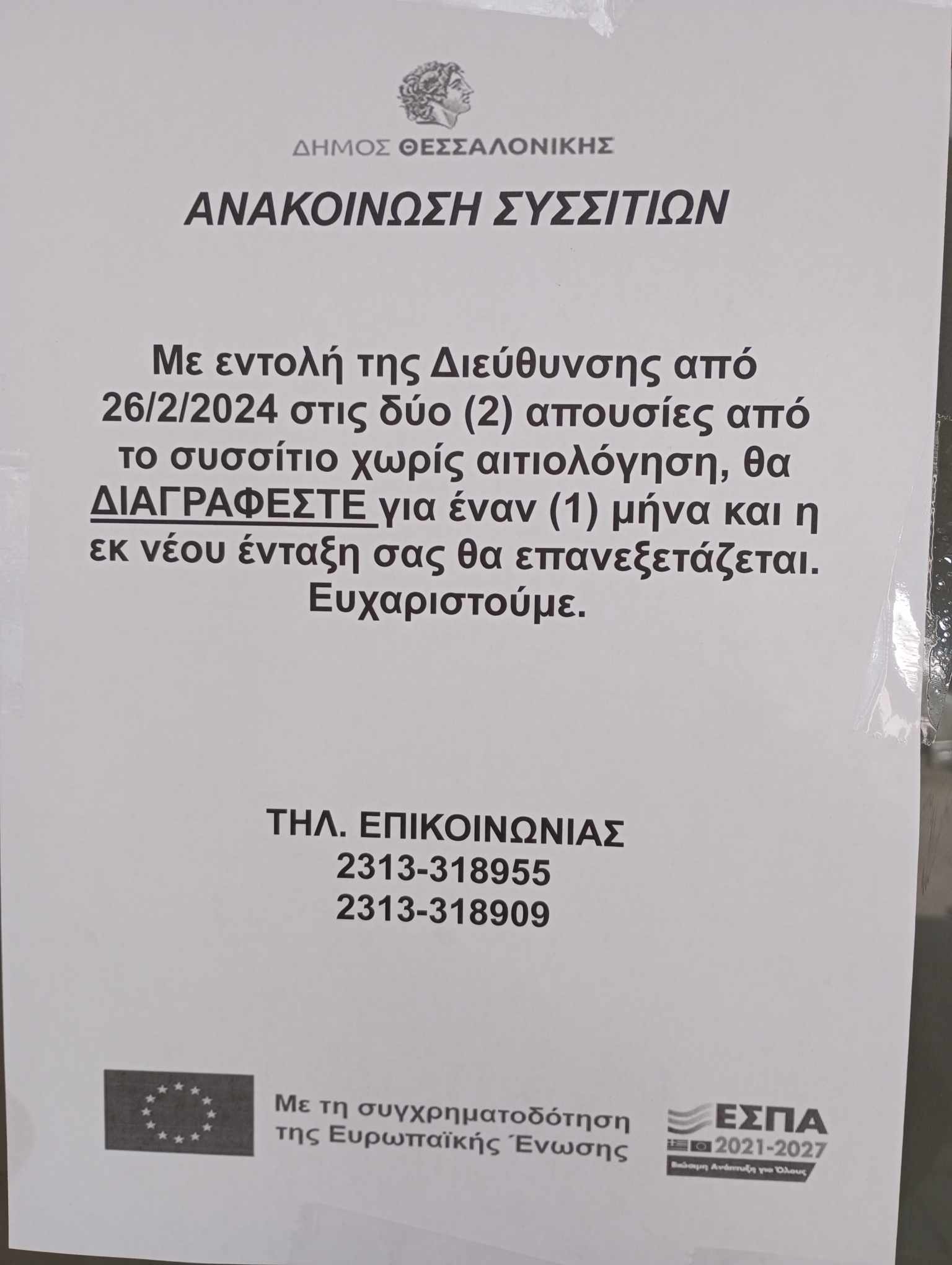 Η θυροκολλημένη ανακοίνωση Υπηρεσίας του Δήμου Θεσσαλονίκης, σε ένα εκ των σημείων διανομής, στην οδό Ειρήνης, σύμφωνα με την οποία από τις 26 Φεβρουαρίου οι ωφελούμενοι που θα καταγράφουν δύο απουσίες χωρίς αιτιολόγηση από το συσσίτιο, θα διαγράφονται από αυτό για έναν μήνα, προκάλεσε αντιδράσεις σε αρκετούς δικαιούχους του προγράμματος.