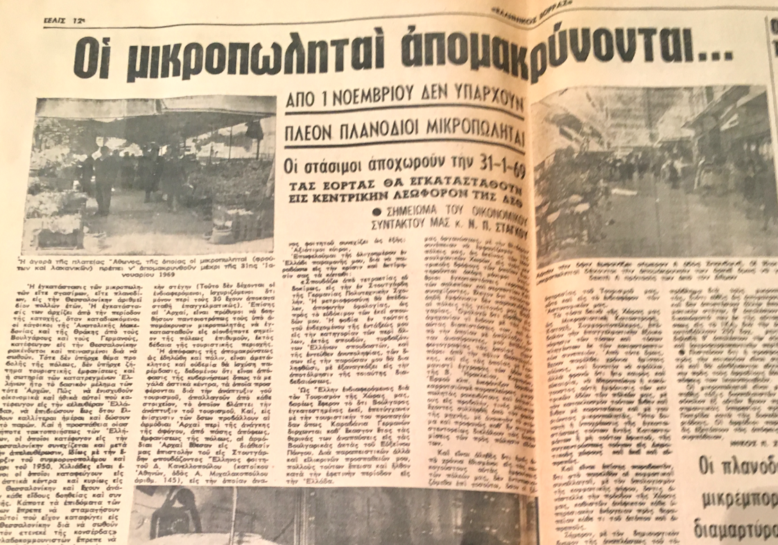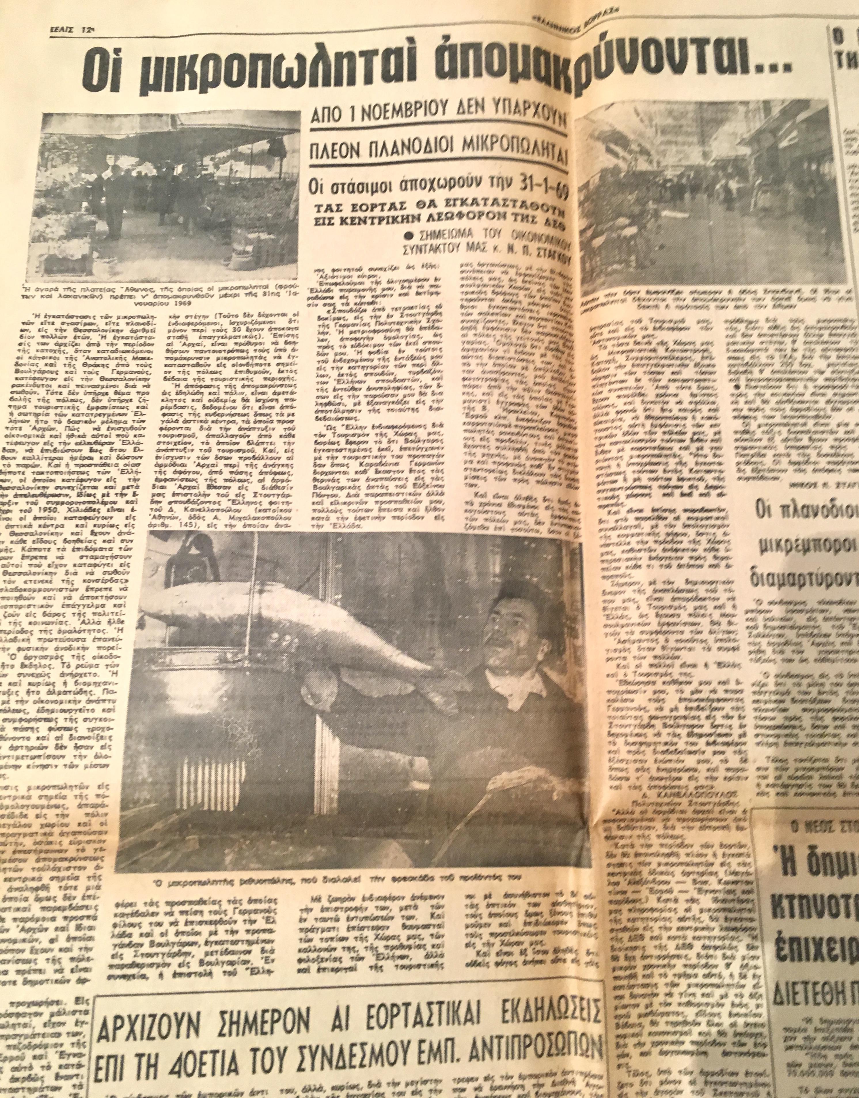 Αυτή είναι μια σελίδα εφημερίδας του 1968. Συγκεκριμένα πρόκειται για ρεπορτάζ του Ελληνικού Βορρά, το φθινόπωρο της χρονιάς και αφορά ένα μεγάλο πρόβλημα του δημόσιου χώρου. Η Θεσσαλονίκη έχει καταληφθεί από πλανόδιους πωλητές και η δημοτική αρχή με την αστυνομία ξεκινούν προσπάθεια να τους απομακρύνουν και να αποκαταστήσουν την εικόνα της πόλης. Σας θυμίζει κάτι αυτό σε σχέση με το σήμερα;