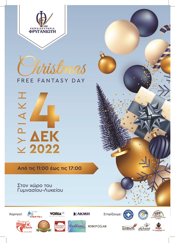 Παράλληλα, στο Free Fantasy Christmas Day θα υπάρχουν όμορφες δράσεις με μουσική και εκπλήξεις ενώ μέσω της λαχειοφόρας αγοράς, με τα έσοδα της οποίας θα στηριχθούν σωματεία της πόλης, έχετε τη δυνατότητα να κερδίσετε πλούσια δώρα.