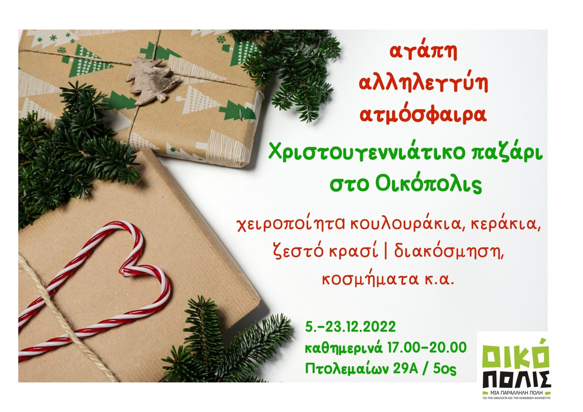 Ένα χριστουγεννιάτικο παζάρι γεμάτο με ρούχα, χειροποίητα κουλουράκια, κεράκια, ζεστό κρασί | διακόσμηση, κοσμήματα κ.α. Από τις 5 μέχρι τις 23.12.2022, κάθε Δευτέρα με Παρασκευή στις 17.00-20.00 στην Πτολεμαίων 29Α.