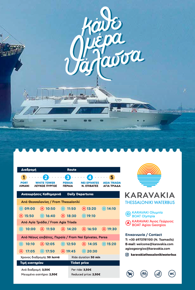 Με το κλασικό μότο «Κάθε Μέρα Θάλασσα», τα «Karavakia Thessaloniki Waterbus», συνεχίζουν κανονικά τα θαλασσινά τους δρομολόγια, και το Σεπτέμβριο!
