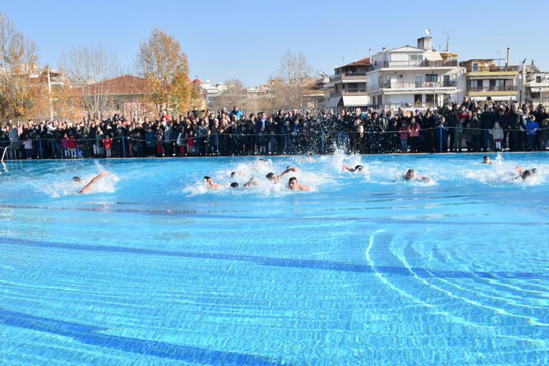 Μετά τον Όρθρο, τη Θεία λειτουργία και τον Μέγα Αγιασμό στον Ιερό Ναό του Προφήτη Ηλία, η πομπή υπό τη συνοδεία της φιλαρμονικής ορχήστρας της Δημοτικής Κοινωφελούς Επιχείρησης «ΙΡΙΣ» και τη διεύθυνση του μαέστρου Άγγελου Καραπινίδη, κατευθύνθηκαν προς το Δημοτικό Κολυμβητήριο όπου είκοσι συμπολίτες μας βούτηξαν στα νερά για να πιάσουν το Σταυρό και να λάβουν την ευλογία του πατέρα Τιμόθεου. Το Σταυρό έπιασε τελικά ο 26χρονος στρατιωτικός Αλέξανδρος Γκόλφος ενώ μαζί του βούτηξαν οι Βλαδίμηρος Σπυρίδης, Γεώργιος Πατσέλης, Αλέξης Ιωαννίδης, Χρήστος Λουλούδης, Σταύρος Πανούσης, Μάριος Πανούσης, Μάριος Λώλος, Ηλίας Παπαδογιαννάκης, Παύλος Κοτσάκης, Βέργος Κόλτσος, Νεκτάριος Παπαγολάνης, Ιωάννης Μαυρουδής Κοσμιάδης, Κωνσταντίνος Μάρκου, Ιωάννης Ιωαννίδης, Δημήτριος Μιχαηλίδης, Αθανάσιος Τζίμος, Γρηγόριος Μιχαηλούδης, Νίκος Κοσμίδης, Βασίλης Ουζούνογλου.