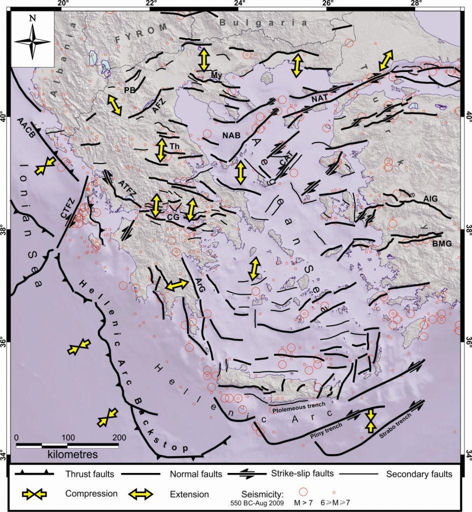 Το βόρειο Αιγαίο και ιδιαίτερα η «Τάφρος» διασχίζεται από ρήγματα, τα οποία έχουν δυναμικό για ισχυρότατους σεισμούς. Το ευτύχημα, σύμφωνα με τον κ. Παυλίδη, είναι ότι οι περισσότεροι είναι υποθαλάσσιοι μακριά από κατοικημένες περιοχές χωρίς συνέπειες. Στη βορειοδυτική Ελλάδα κυριότερα ρήγματα είναι αυτά στη λεκάνη της Πτολεμαΐδας.