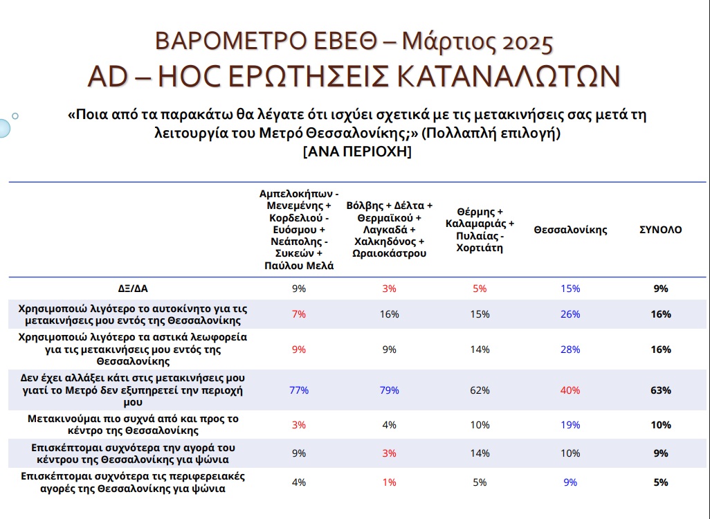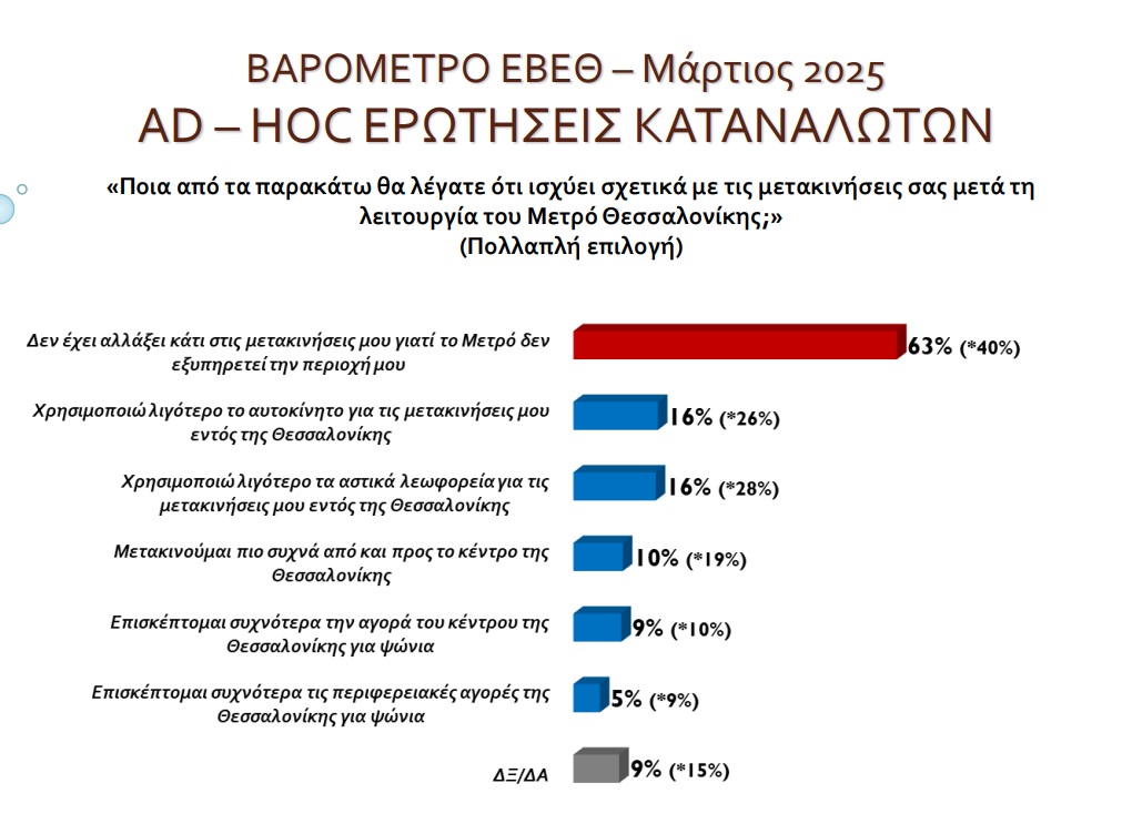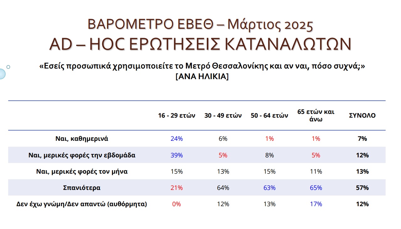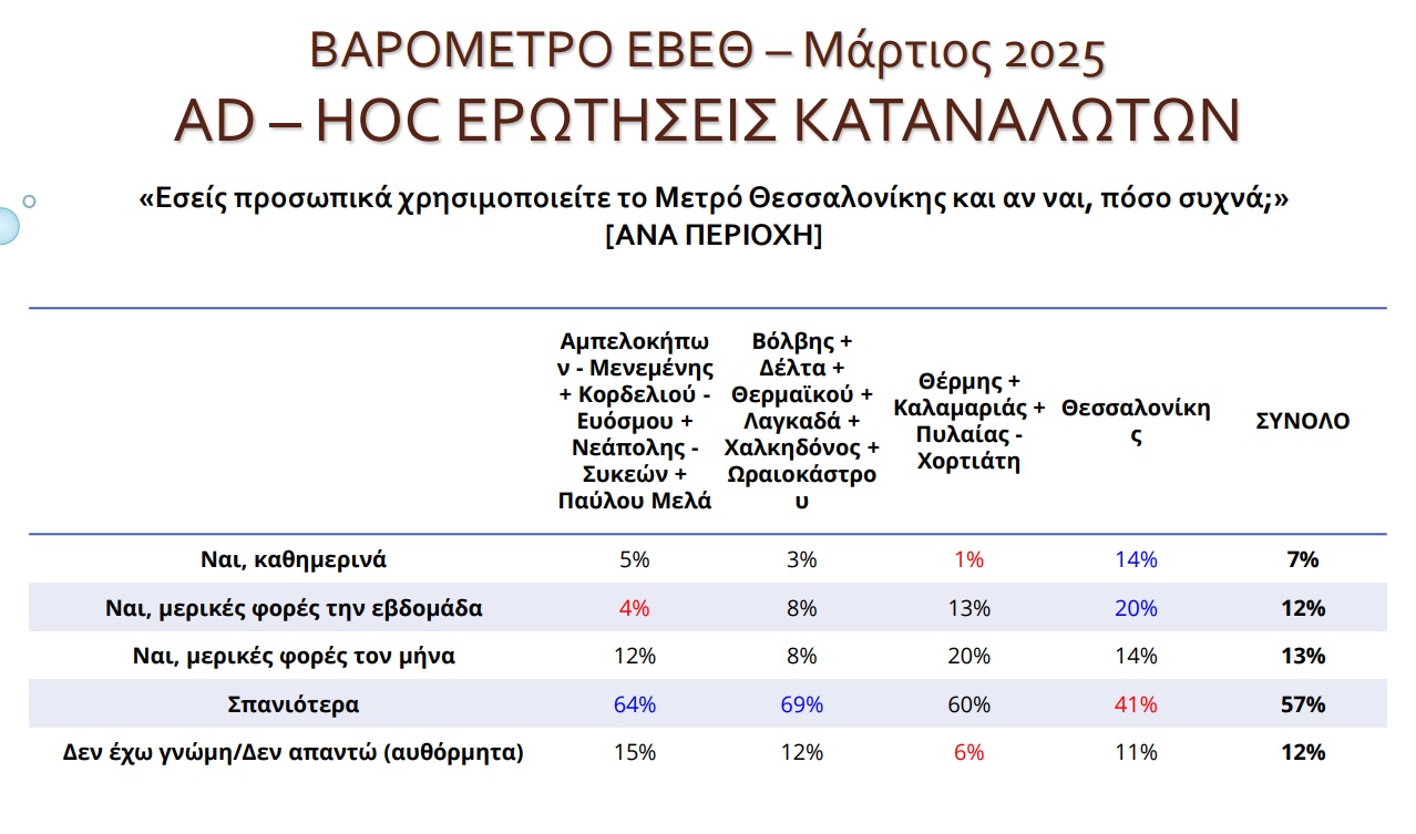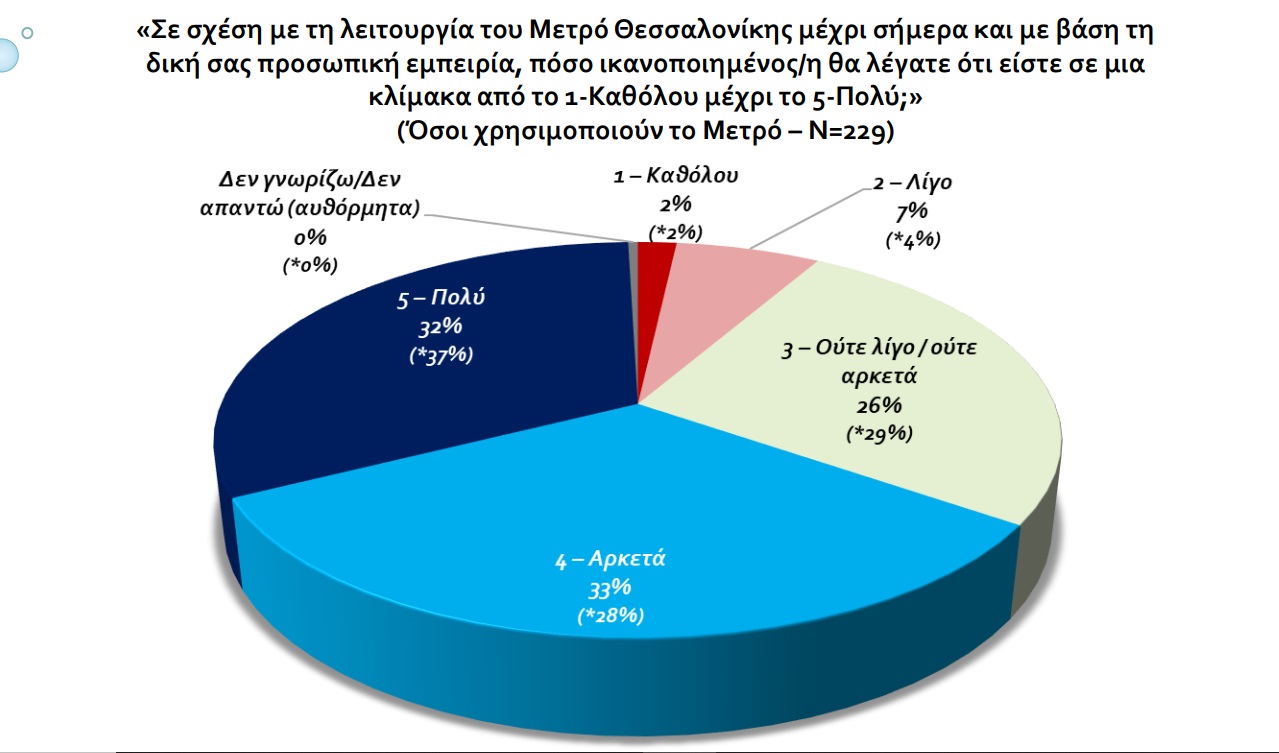 Από την έρευνα προκύπτει ότι 1 στους 3 κατοίκους του νομού Θεσσαλονίκης, το 32%, δηλώνουν ότι χρησιμοποιούν το Μετρό της πόλης είτε καθημερινά (7%), είτε μερικές φορές την εβδομάδα (12%), είτε μερικές φορές τον μήνα (13%).