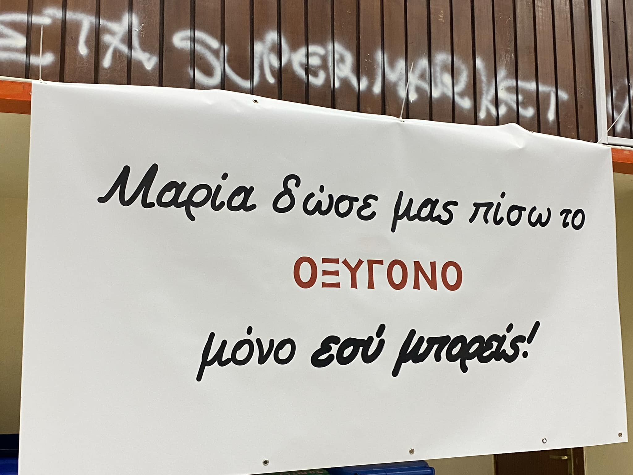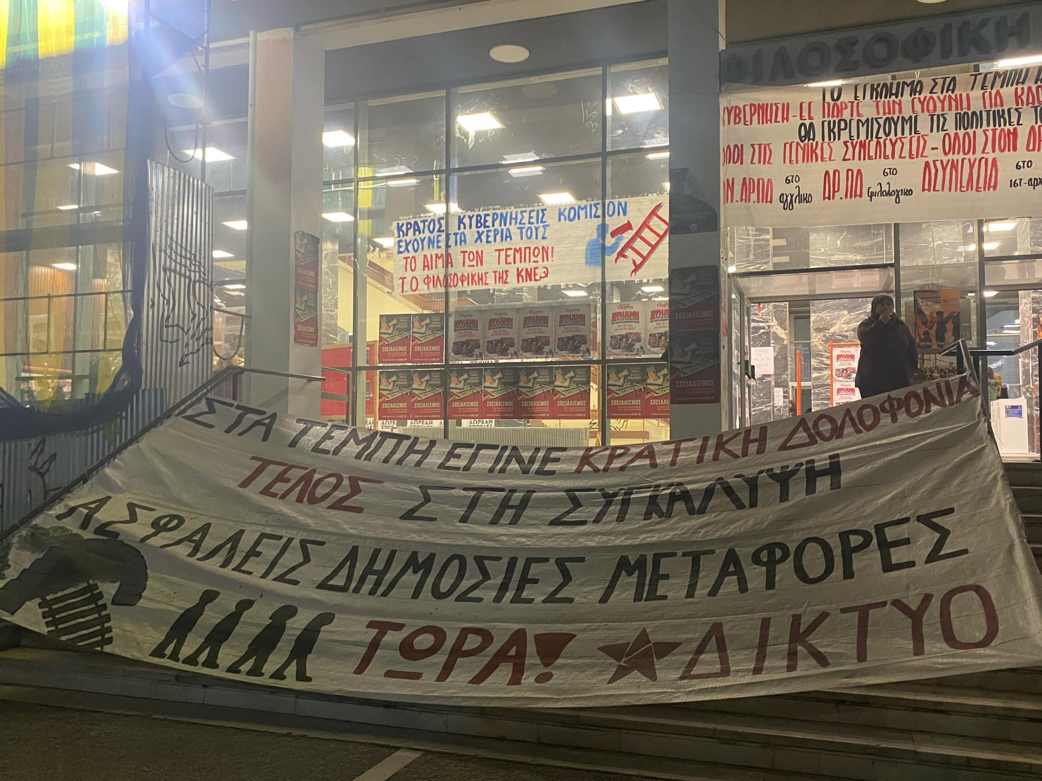 Έξω από το κτίριο, υπήρχαν αναρτημένα πολλά πανό με συνθήματα για το δυστύχημα.
