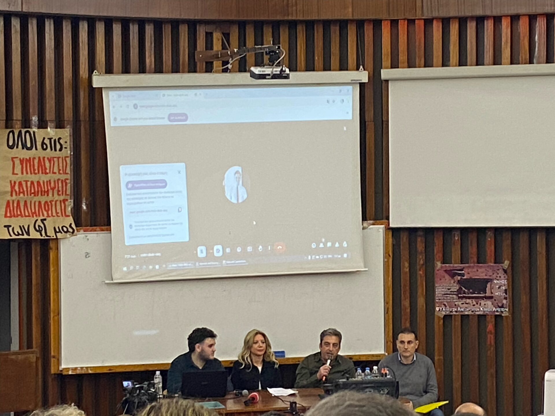Διαδικτυακά παρούσα ήταν και η κ. Μαρία Γράτσια, δικηγόρος του Συλλόγου των συγγενών των θυμάτων Τεμπών, η οποία αναφέρθηκε στα τελευταία γεγονότα και την μήνυση των συγγενών κατά του κ. Μπακαΐμη.