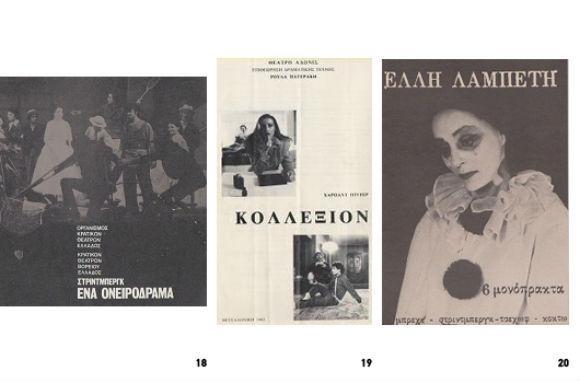 20. Στο πρόγραμμα που συνοδεύει την παράσταση της Έλλης Λαμπέτη με τα 6 μονόπρακτα στην Εταιρία Μακεδονικών Σπουδών δεν υπάρχει αναφορά σε χρονιά. Αρχές του δεύτερου μισού δεκαετίας ’70 νομίζω.