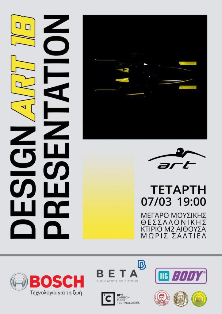 Πιο συγκεκριμένα, την παρουσίαση των σχεδίων του νέου αγωνιστικού μονοθεσίου της ART18 θα πραγματοποιήσει η Aristotle Racing Team (ART), την Τετάρτη 7 Μαρτίου 2018 και ώρα 19:00, στο Μέγαρο Μουσικής Θεσσαλονίκης, Κτίριο Μ2 (αίθουσα «Μωρίς Σαλτιέλ»), σε μια εκδήλωση ανοιχτή για το κοινό.