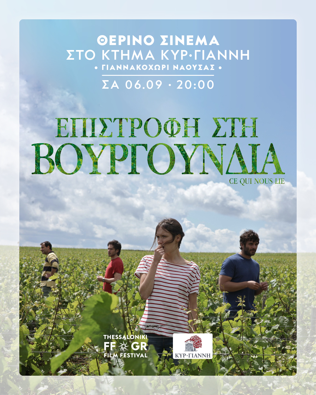 Το Σάββατο 6 Σεπτεμβρίου, λίγο πριν από την πανσέληνο, θα προβληθεί μέσα στον πανέμορφο αμπελώνα του Κτήματος στο Γιαννακοχώρι Νάουσας η ταινία Επιστροφή στη Βουργουνδία του πολυβραβευμένου σκηνοθέτη Σεντρίκ Κλαπίς, ένας ύμνος στην αγάπη και τις τέσσερις εποχές του κρασιού.