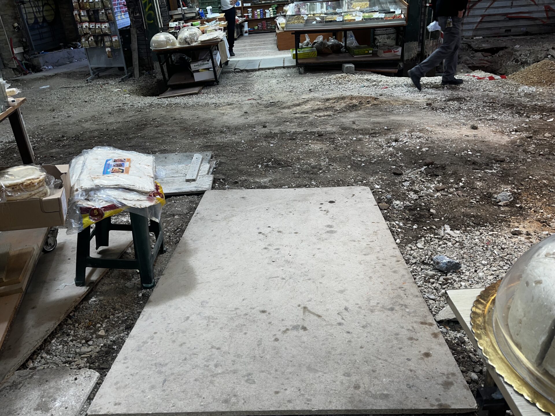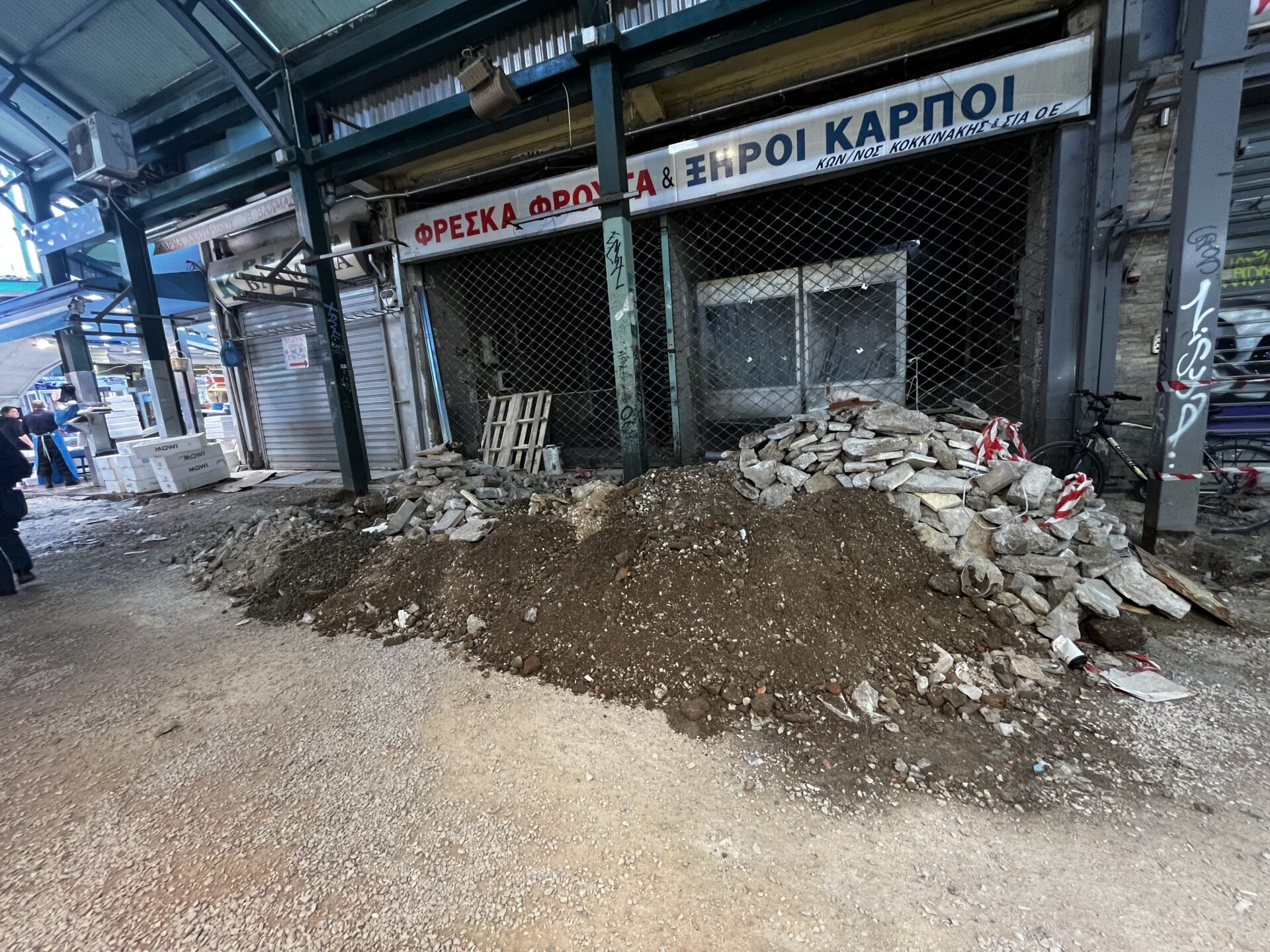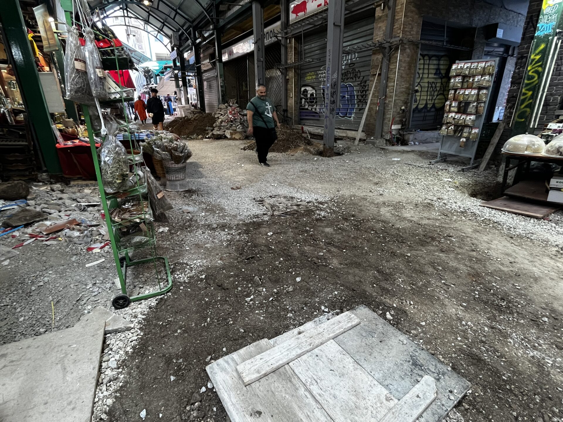 Μπροστά, δίπλα και ανάμεσα από τα μαγαζιά που πουλάνε τρόφιμα, από γλυκά, ξηρούς καρπούς, ψάρια και κρέατα, βλέπεις τούβλα, ξύλινες παλέτες, μηχανήματα και η ατμόσφαιρα είναι γεμάτη σκόνη, με τον κόσμο να αποφεύγει την κλασική περατζάδα που κάποτε χαρακτήριζε την αγορά.