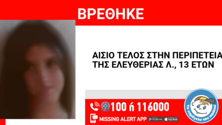 Η περιπέτεια της Ελευθερίας Λ., 13 ετών, έληξε στις 03/11/2025, βραδινές ώρες δίνοντας τέλος στην αγωνία των δικών της ανθρώπων που την αναζητούσαν. Η Ελευθερίας Λ. επικοινώνησε με τους γονείς της, όπου άμεσα βρέθηκαν κοντά της και είναι καλά στη υγεία της.